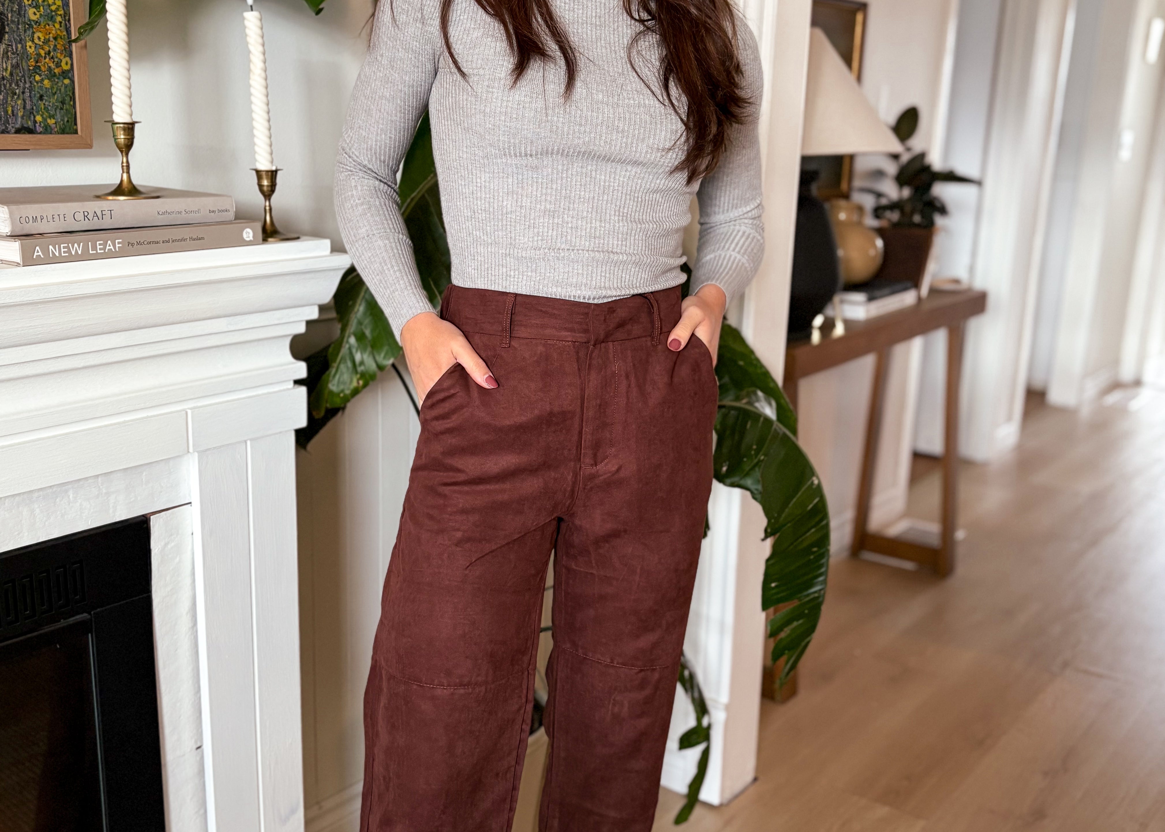 The Cassie Faux Suede Straight Leg Woven Pants in Dark Brown