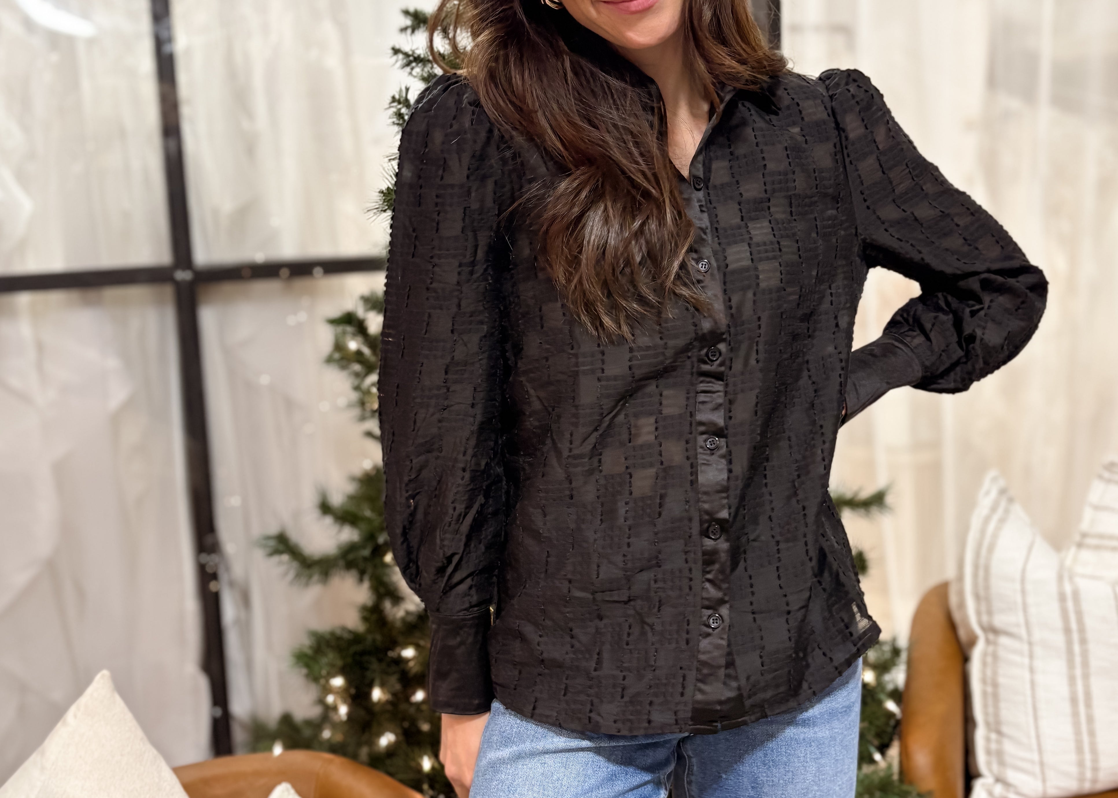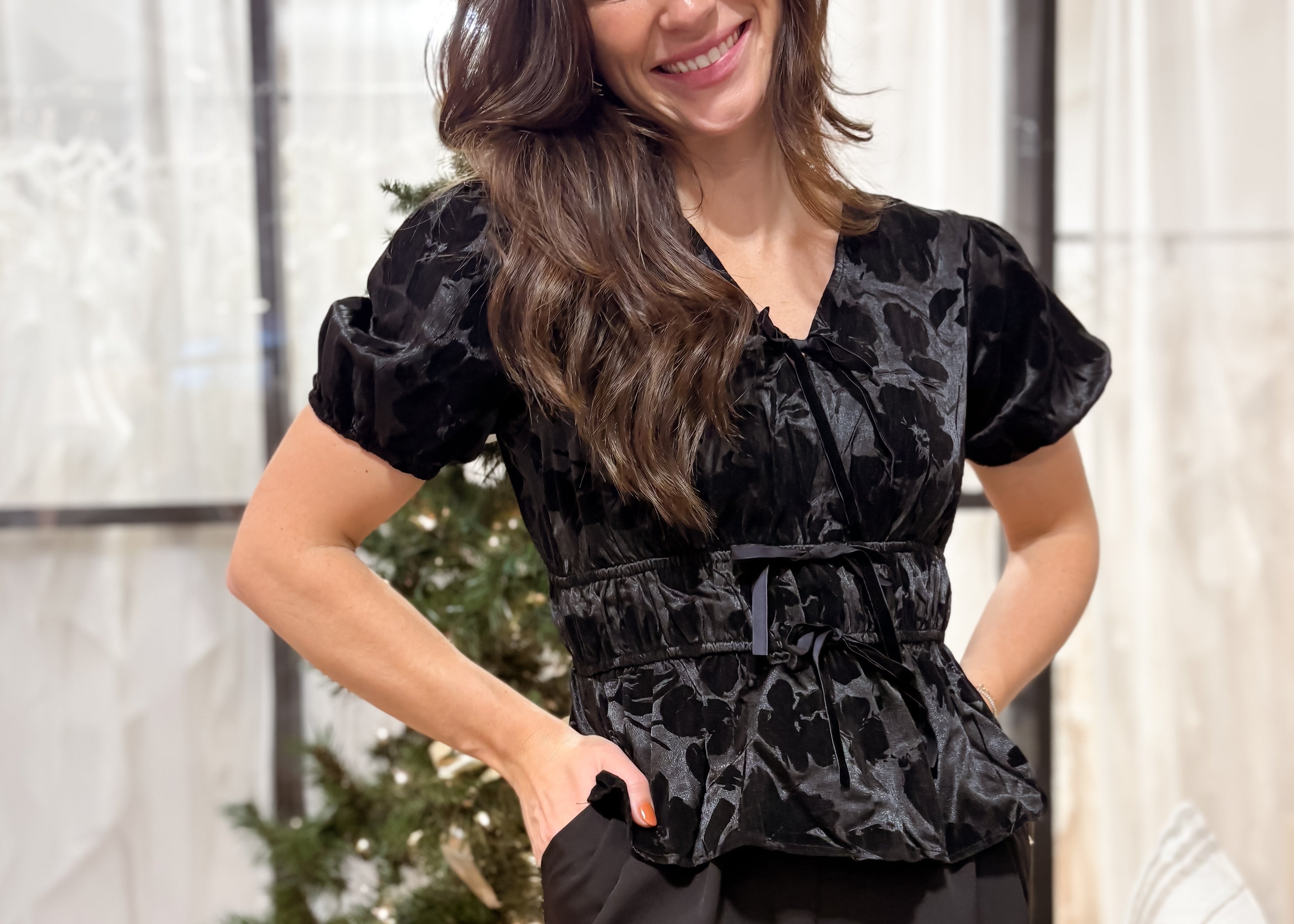 The Vivianne Satin Velvet Floral Front Tie Puff Sleeve Blouse in Black
