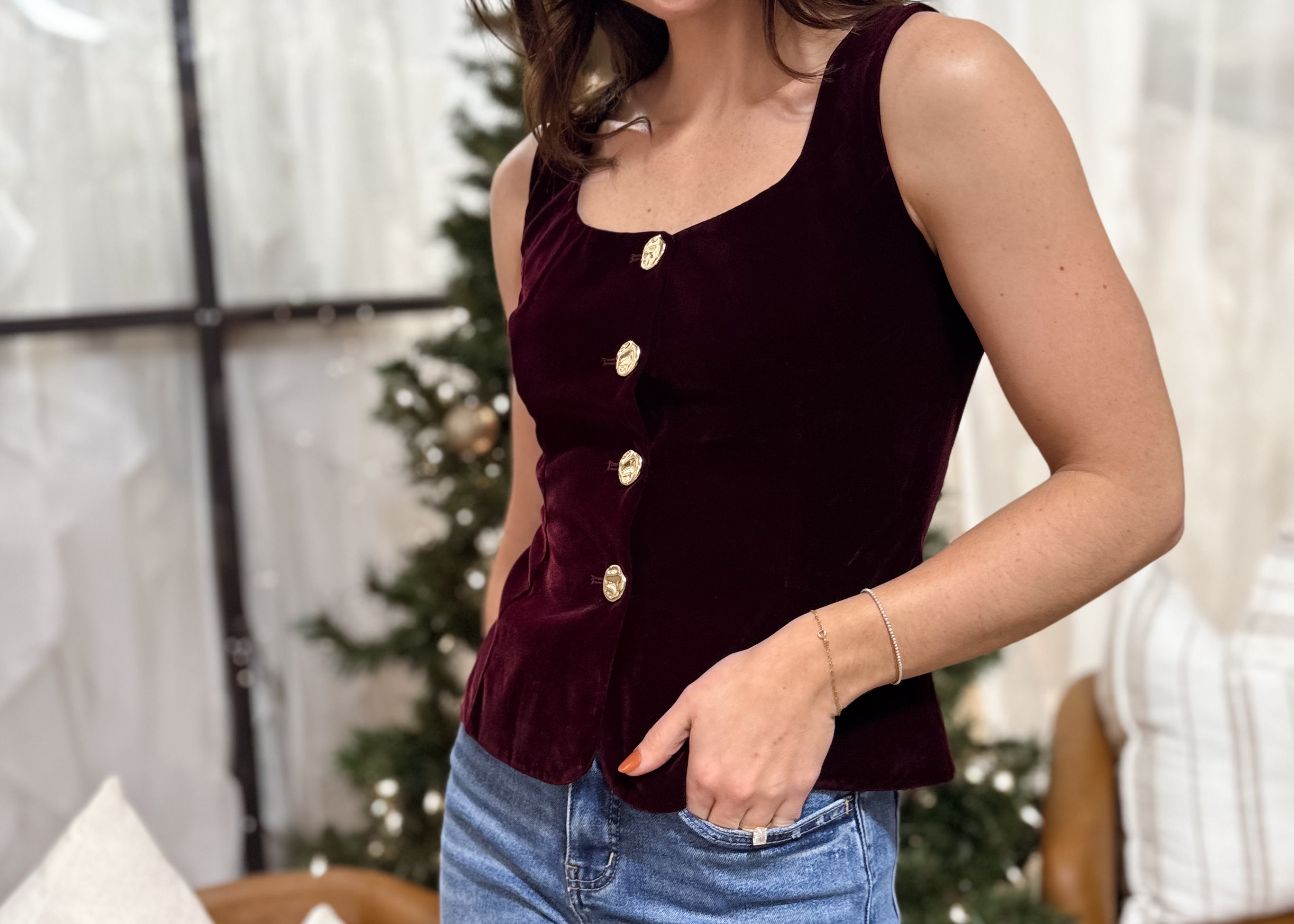 The Bernice Burgundy Velvet Gold Button Sleeveless Vest