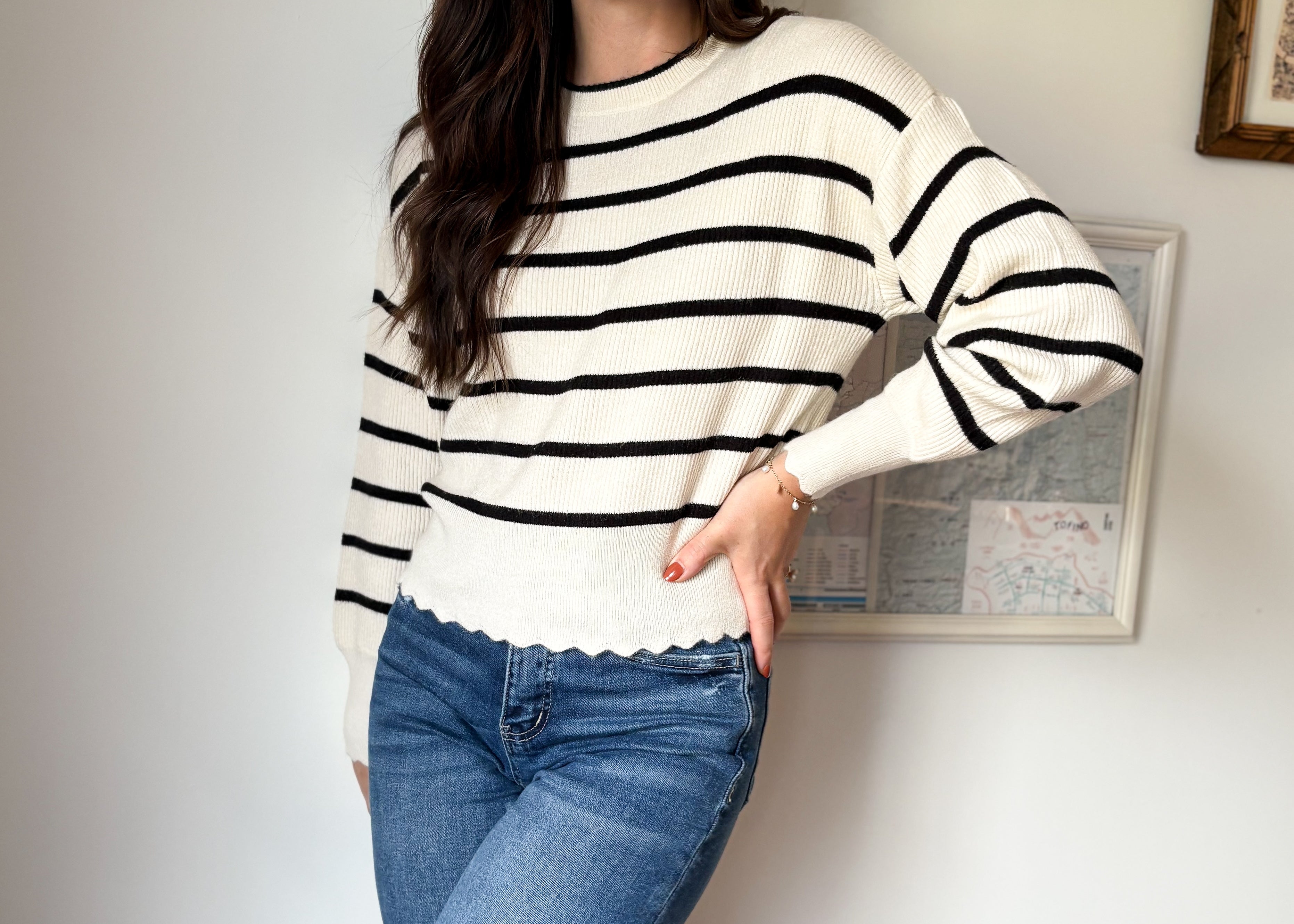 The Livie Long Sleeve Stripe Knit Sweater with Scalloped Edge