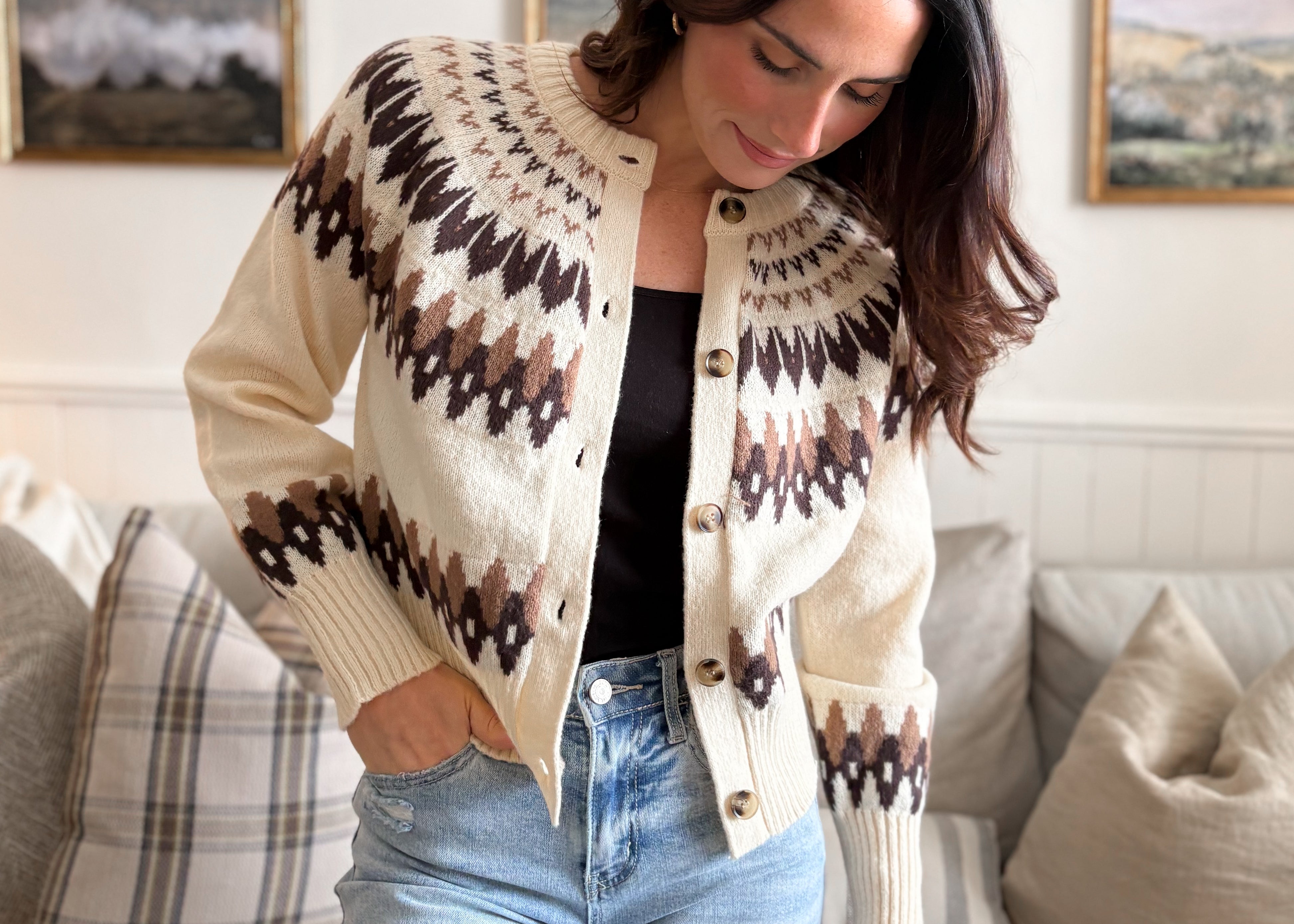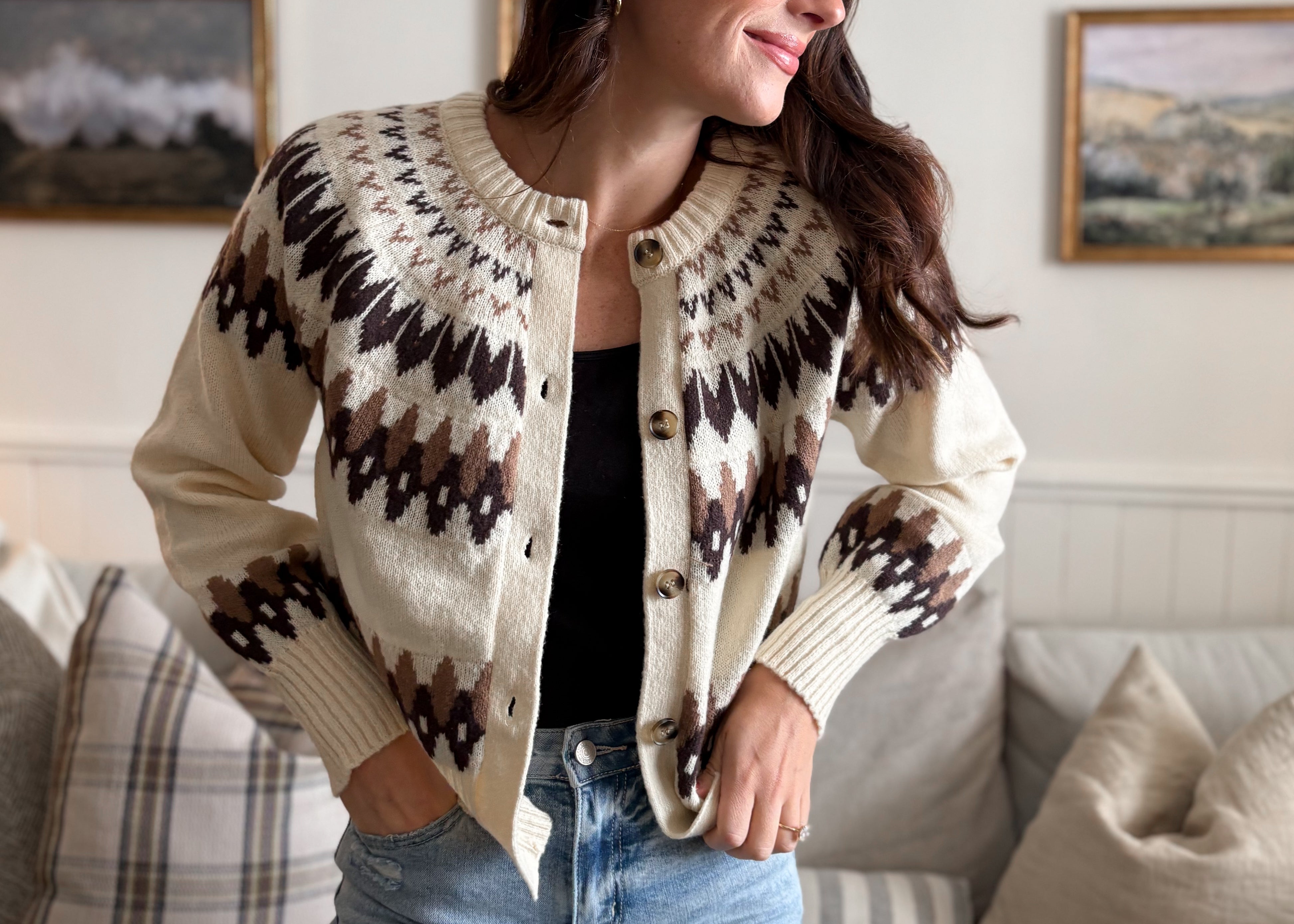 The Elsa Multicolor Fair Isle Button Down Knit Cardigan in Ivory