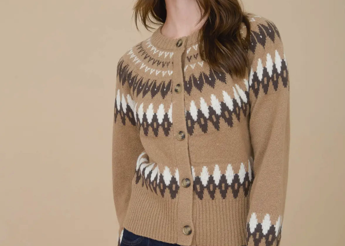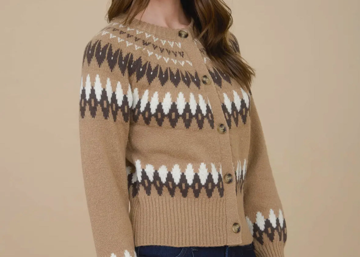 Multicolor Fair Isle Button Down Knit Cardigan in Khaki