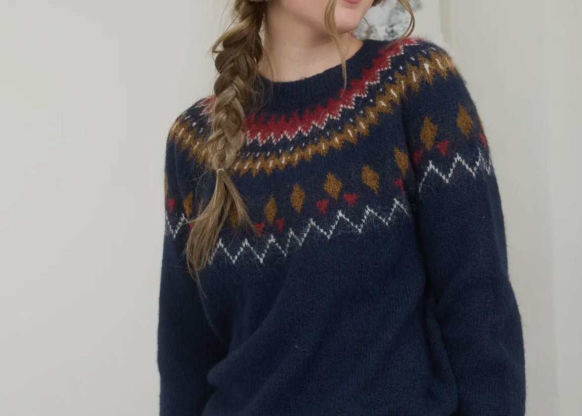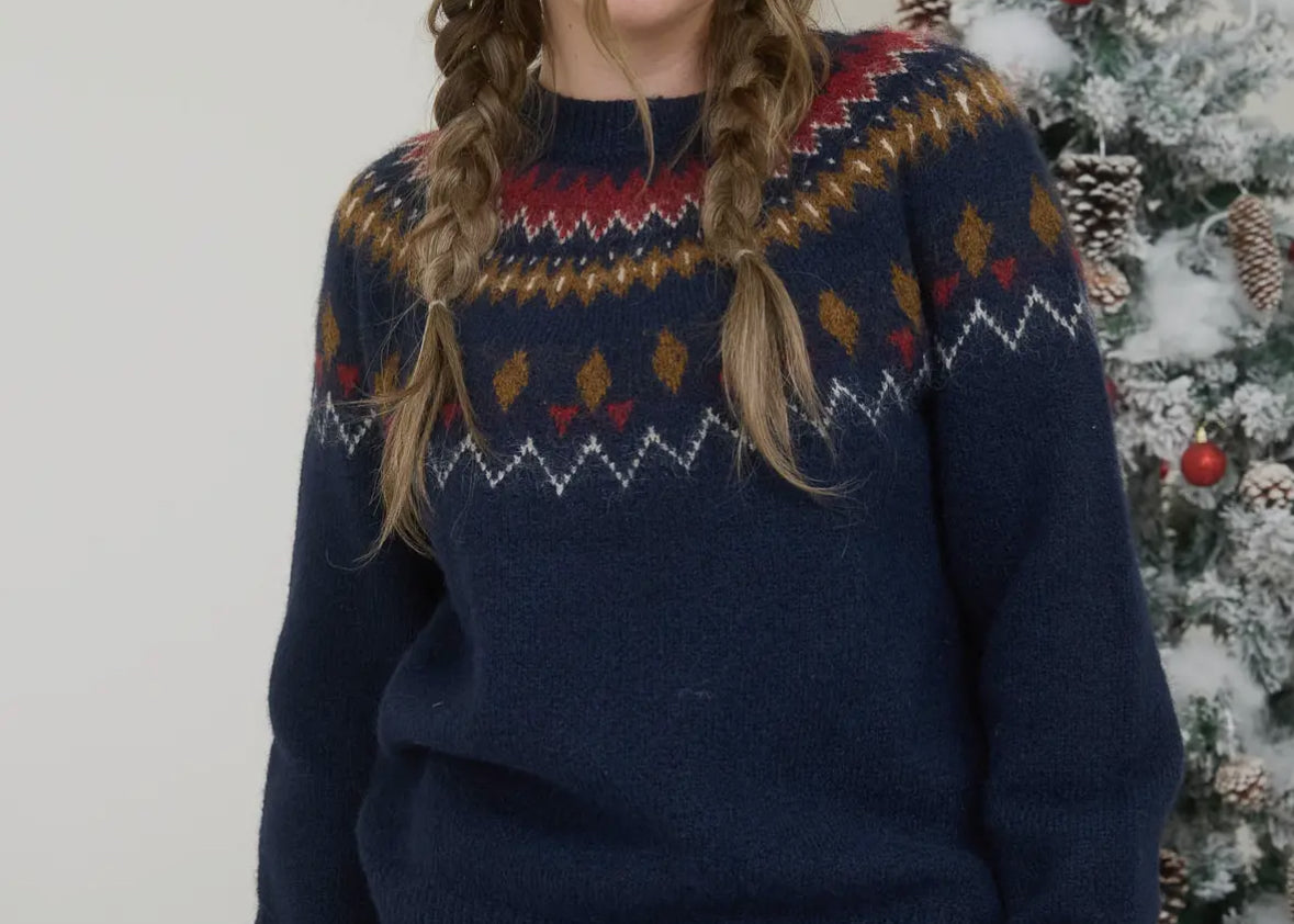 Fuzzy Fair Isle Crew Neck Knit Pullover Sweater in Navy
