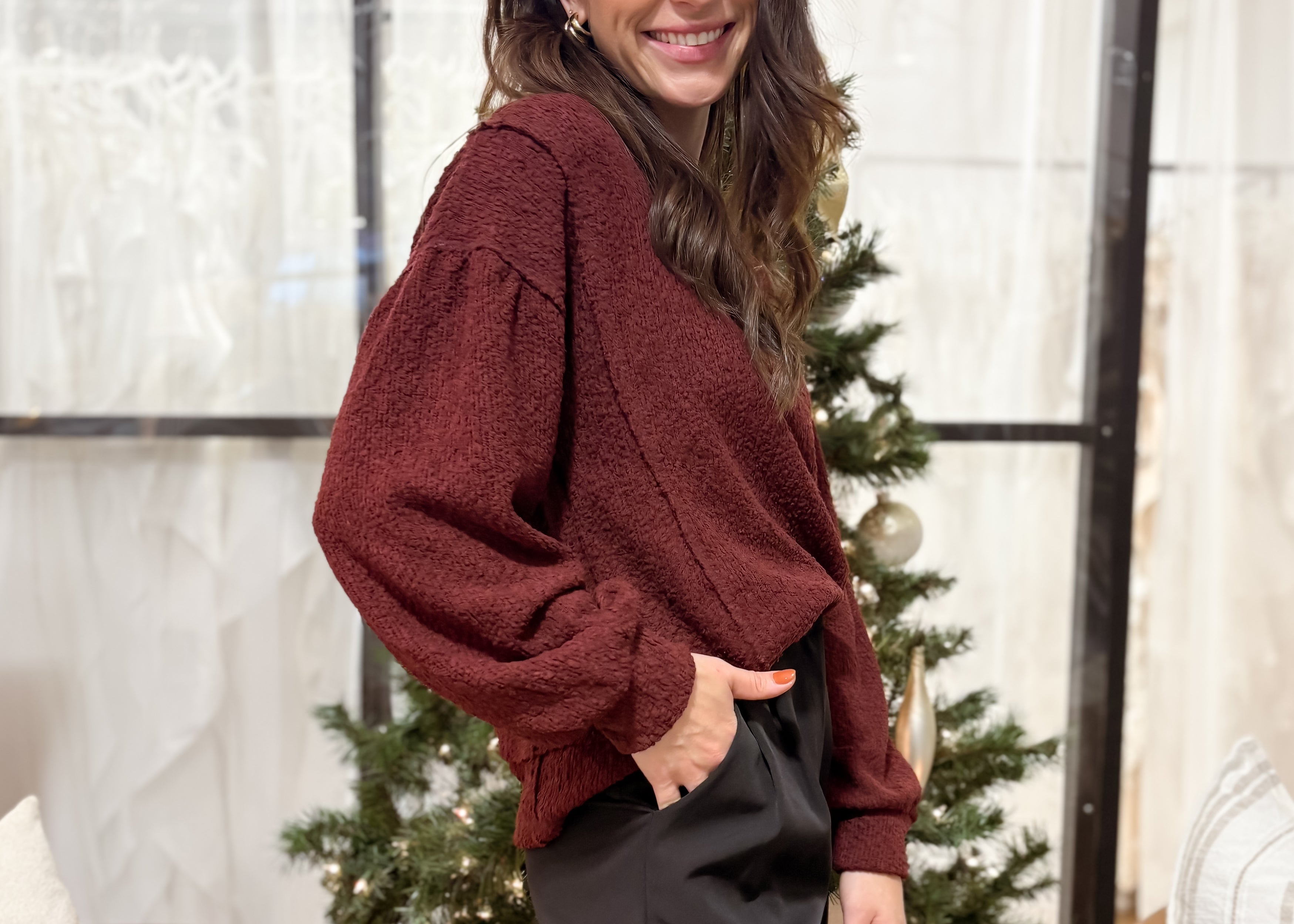 The Marla Round Neck Textured Knit Oversized Top in Burgundy