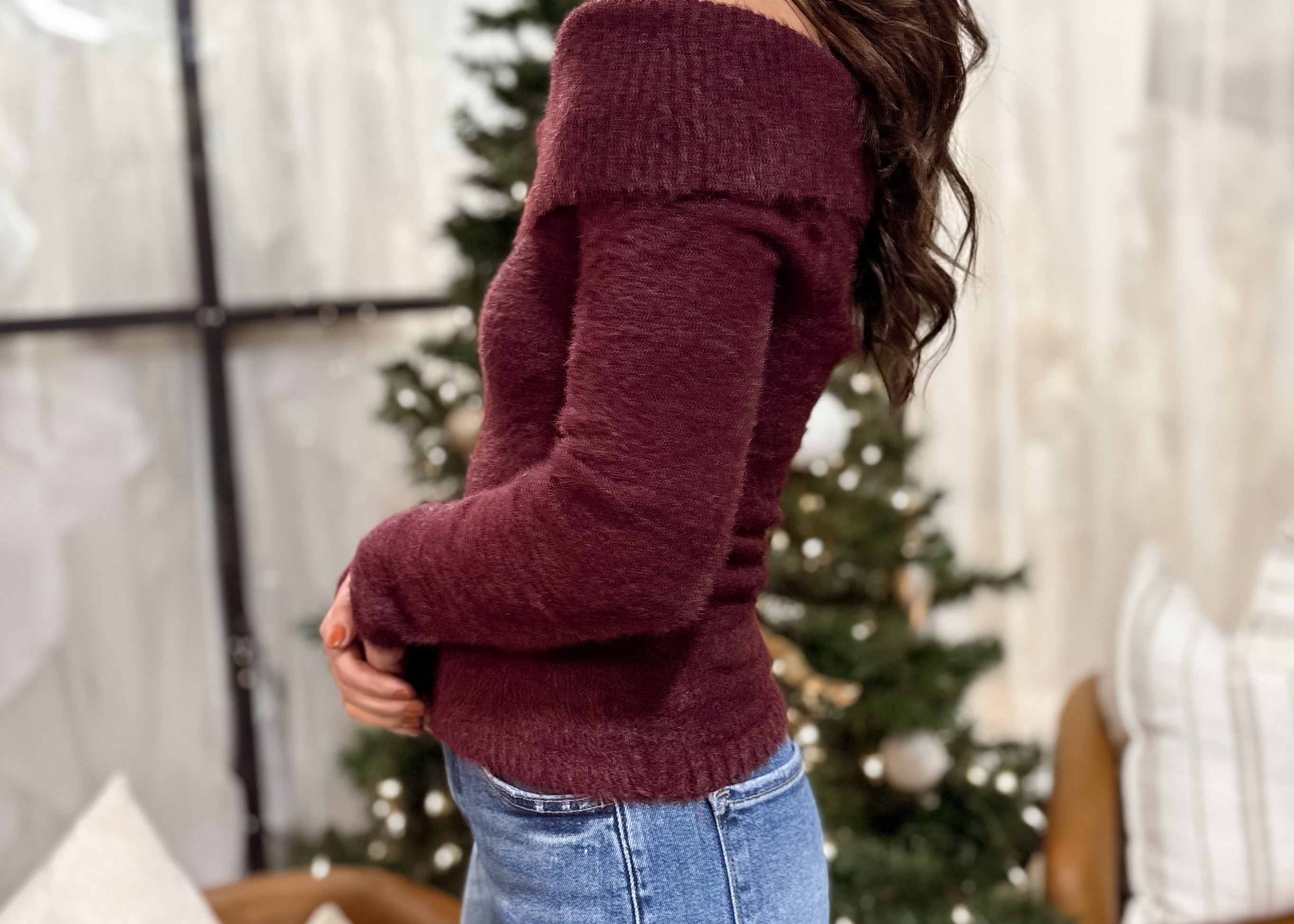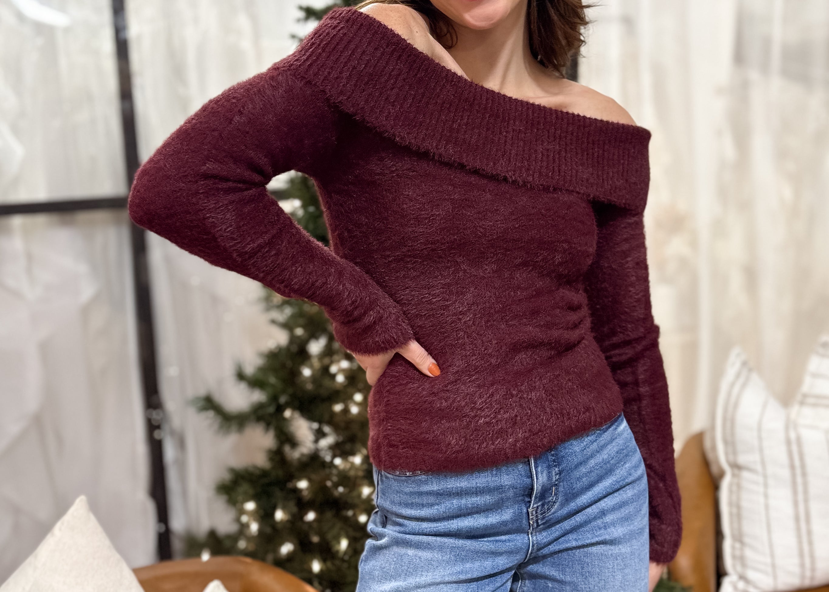 The Taylor Off Shoulder Fold Over Blushed Knit Sweater