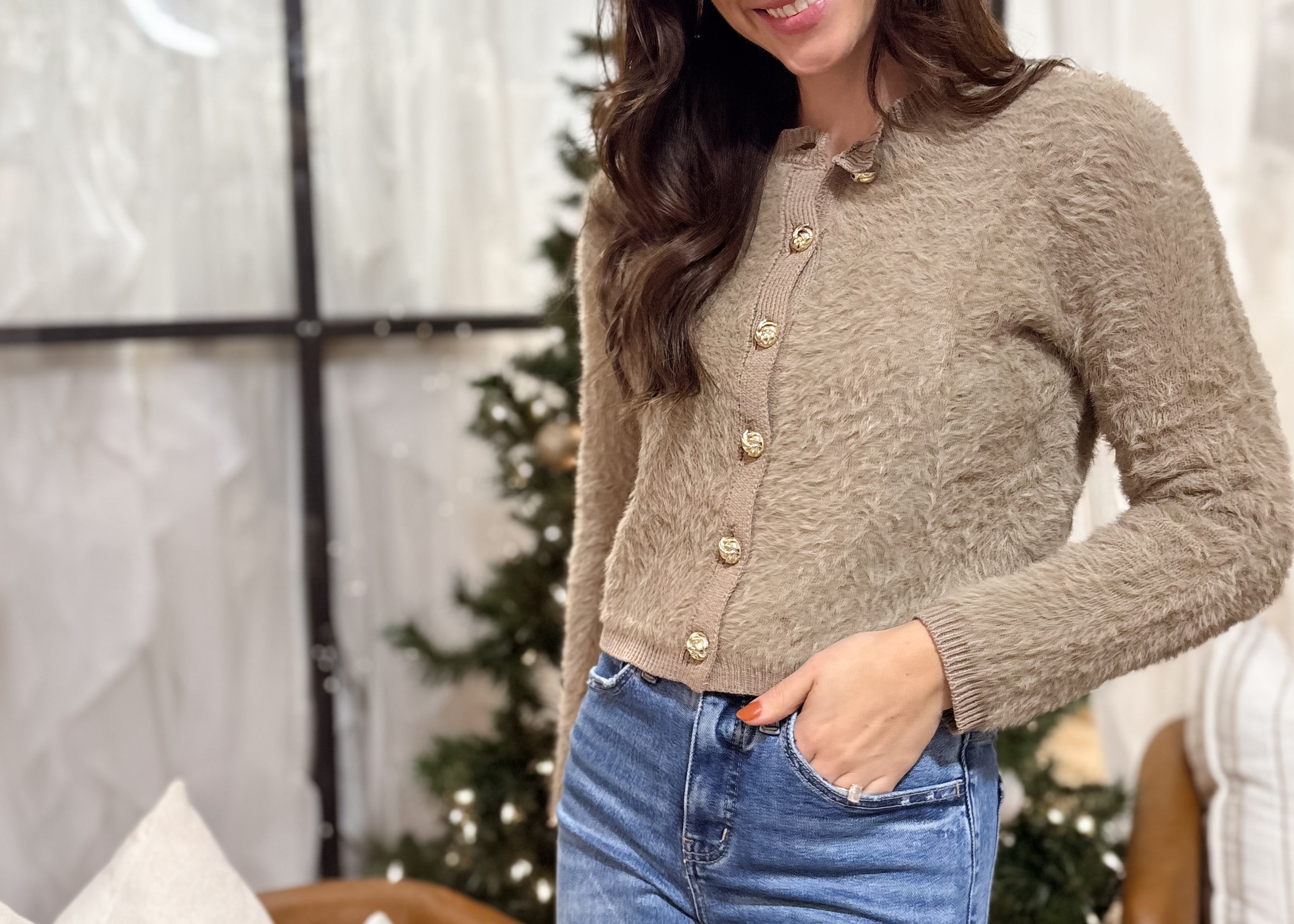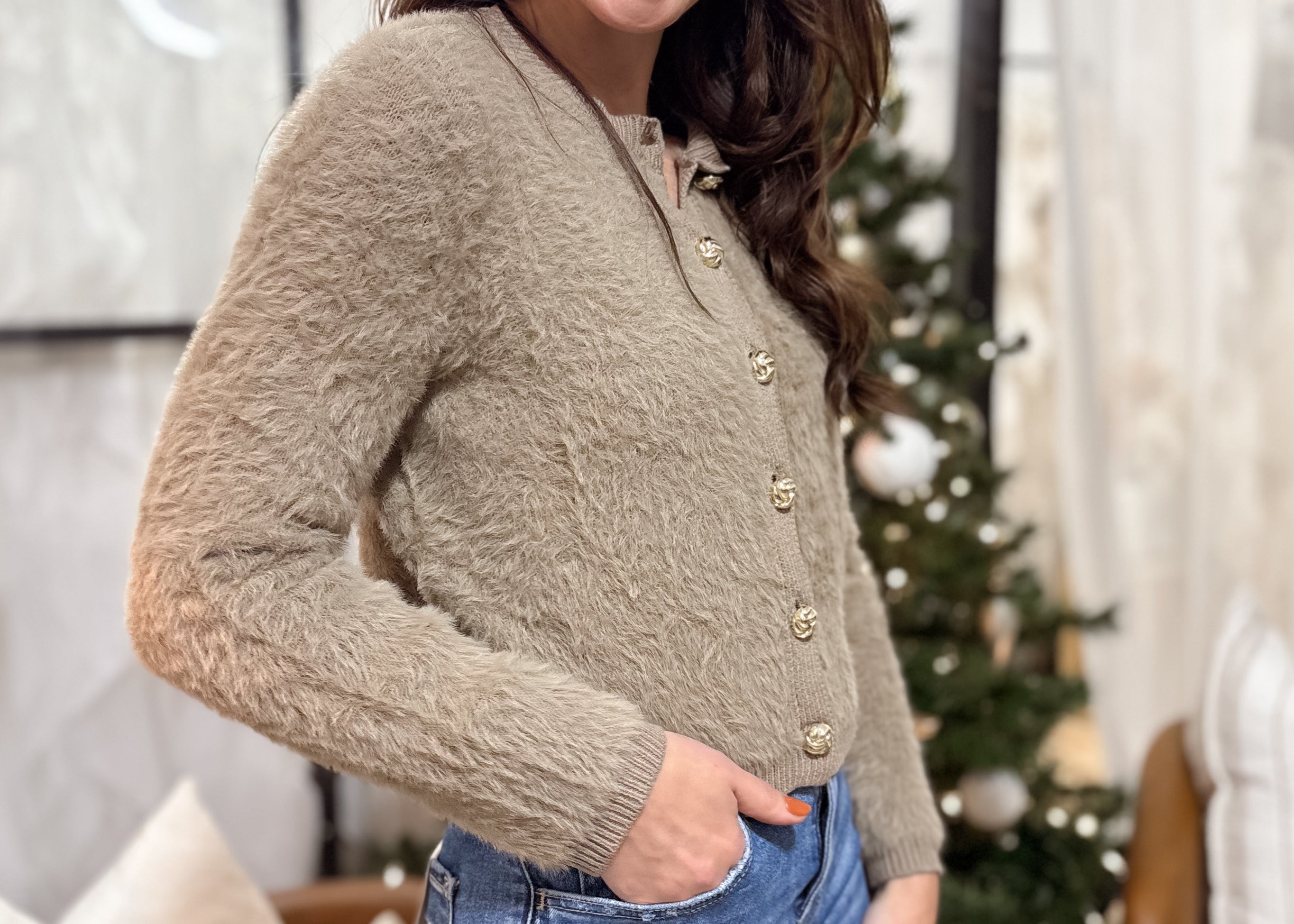 The Faye Gold Button Down Fuzzy Knit Cardigan in Mocha