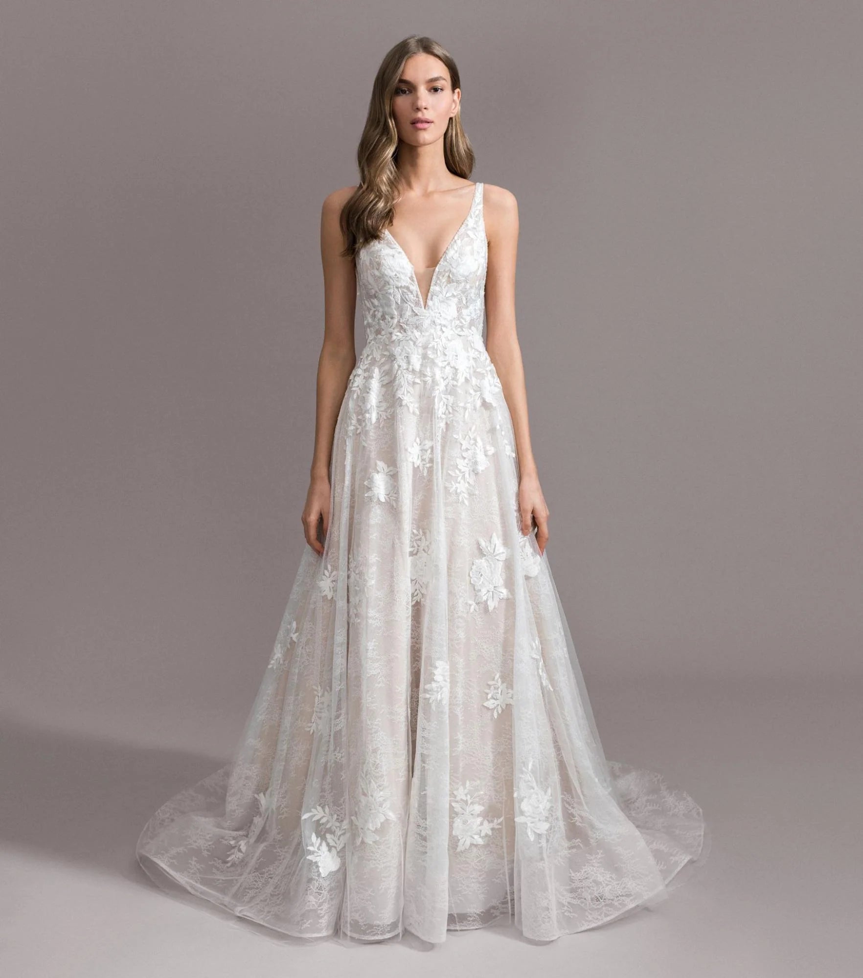 Known for her soft, ethereal designs, Jenny Yoo's dresses are ideal for brides seeking elegance and minimalism. Her use of flowing fabrics and delicate lace creates a timeless look that’s perfect for any wedding theme. With a focus on comfort and versatility, Jenny Yoo offers a range of styles, from classic ball gowns to fitted mermaid silhouettes. This brand is perfect for brides seeking a refined, minimalist look with an added touch of romance.