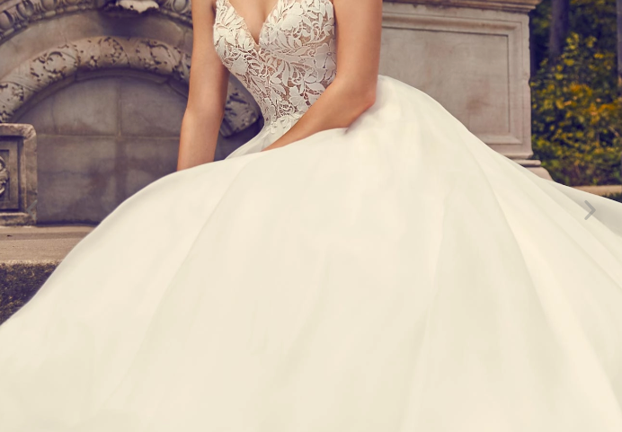 Organza, Guipure Lace, and Embroidered Tulle Wedding Dress. Embroidered Tulle bodice with V-neckline, Guipure Lace Appliqués, and spaghetti straps. Bodice lined in Italian Tulle. Full Organza skirt with 2″ horsehair on hem with pockets.