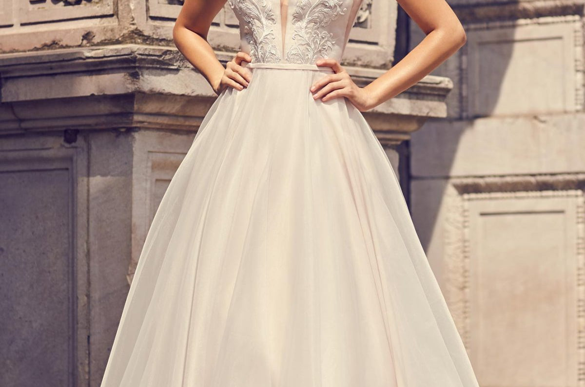 Organza and Embroidered Appliqué Wedding Dress. Plunging V-neckline bodice with Embroidered Appliqué detail and V-shaped Italian Tulle inserts at side seams on bodice. Fabric belt at waist. Full Organza skirt with 4" horsehair at hem and pockets. Shown in Latte. Also available in Natural.