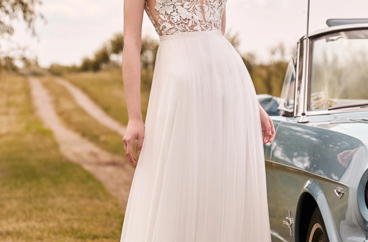 Mesh Tulle, Embroidered Tulle and Guipure Lace Wedding Dress. Sleeveless Embroidered Tulle bodice with Guipure Lace appliqués and plunging V-neckline, lined in Nude Italian Tulle. V-shaped Italian Tulle inserts at side seams on bodice. Fabric belt at waist. Full Mesh Tulle skirt.