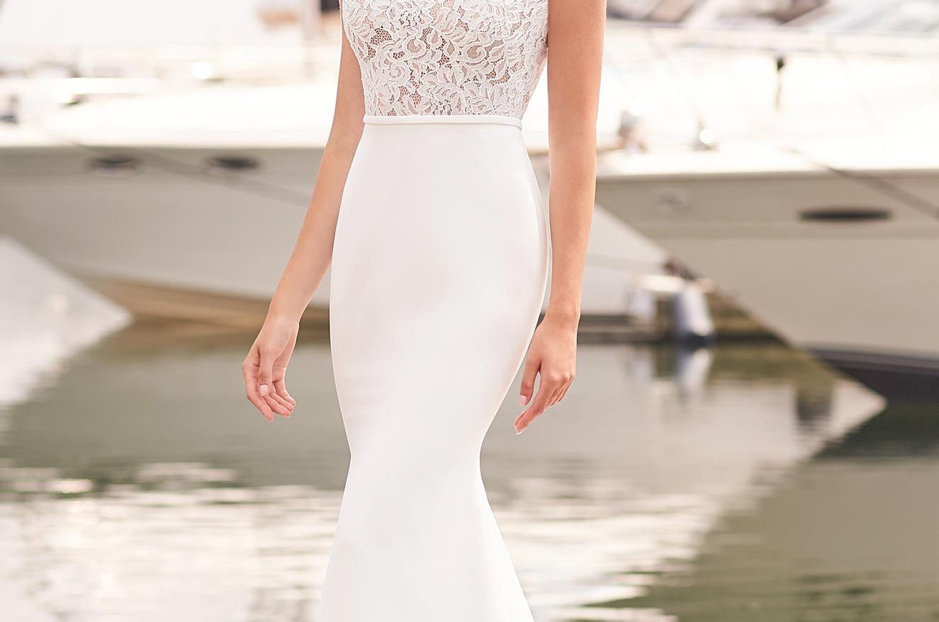 Crêpe and Mikaella Lace Wedding Dress. Mikaella Lace bodice lined with Nude Italian Tulle. Square neckline and cap sleeves. Crêpe belt at waist. Fit and flare Crêpe skirt with fabric covered buttons down center back of skirt to hem.
