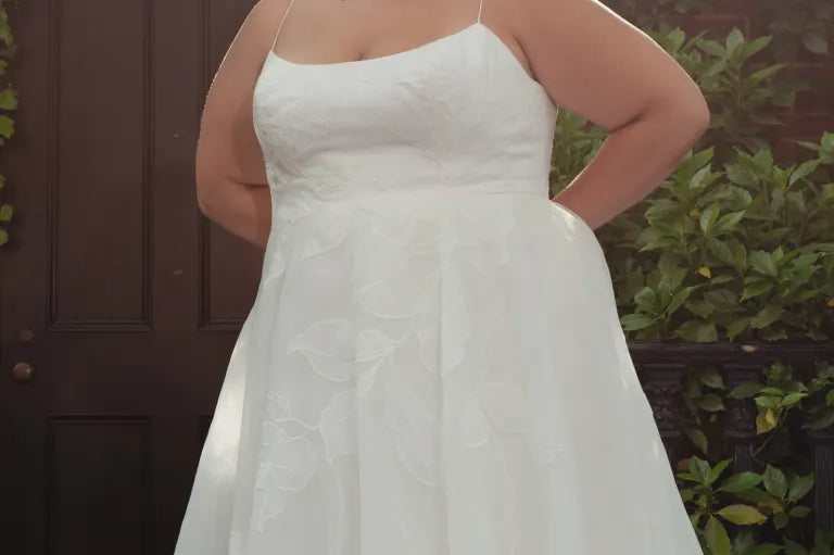 The Abernathy scoop neck organza bridal gown is effortlessly romantic. Oversized floral organza applique trails from the fitted bodice down onto the dramatic yet airy ball skirt.