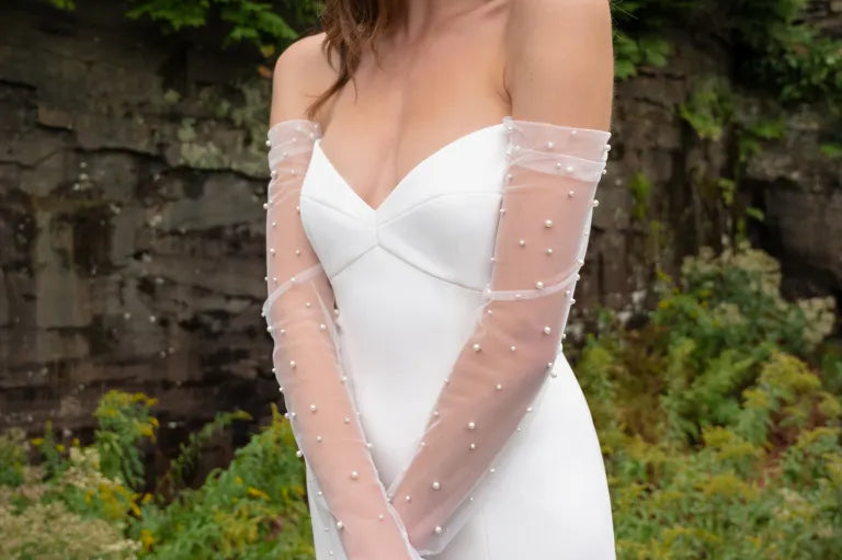 he Alexandra gown is thoroughly modern, with just a touch of whimsy. The fit and flare silhouette, cut in our soft stretch crepe fabric flatters your every curve. The empire bodice, sculpted with thoughtful seaming detail is flanked by delicate, sheer long sleeves dotted with lustrous pearls of varying size. The dramatic cutaway slit adds sultry glamour, and buttons down the back of the cathedral length train add a classic bridal detail. Dress available without slit.