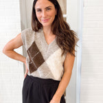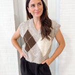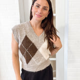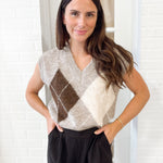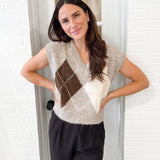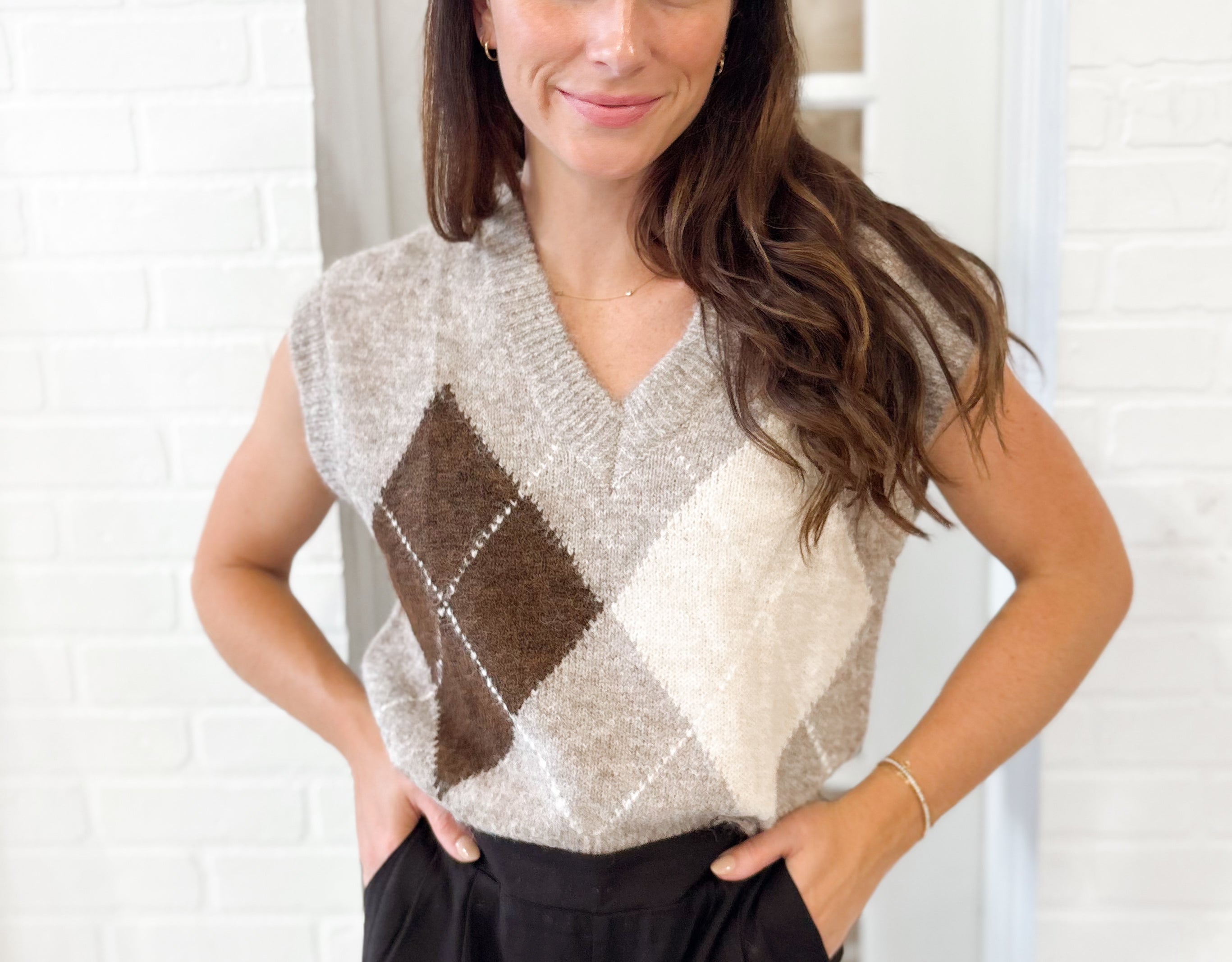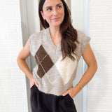 Elevate your wardrobe with this sleeveless sweater vest featuring a timeless argyle pattern in a warm taupe hue. The V-neckline and extended shoulder design offer a modern twist on classic knitwear, perfect for layering or wearing solo. Crafted for both comfort and style, it effortlessly enhances any outfit with a touch of sophistication.