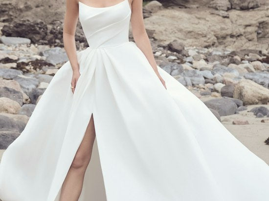 Couture strapless A-line wedding dress with thigh high slit. Couture strapless A-line wedding dress with thigh high slit.