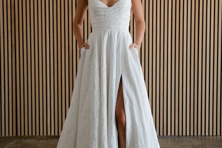 The Beau gown is a true romantic. Cut in our intricately textured beveled floral jacquard fabric, her dramatic silhouette is effortlessly airy. The sculpted bodice is endlessly flattering, and the detachable sleeves offer incredible versatility.