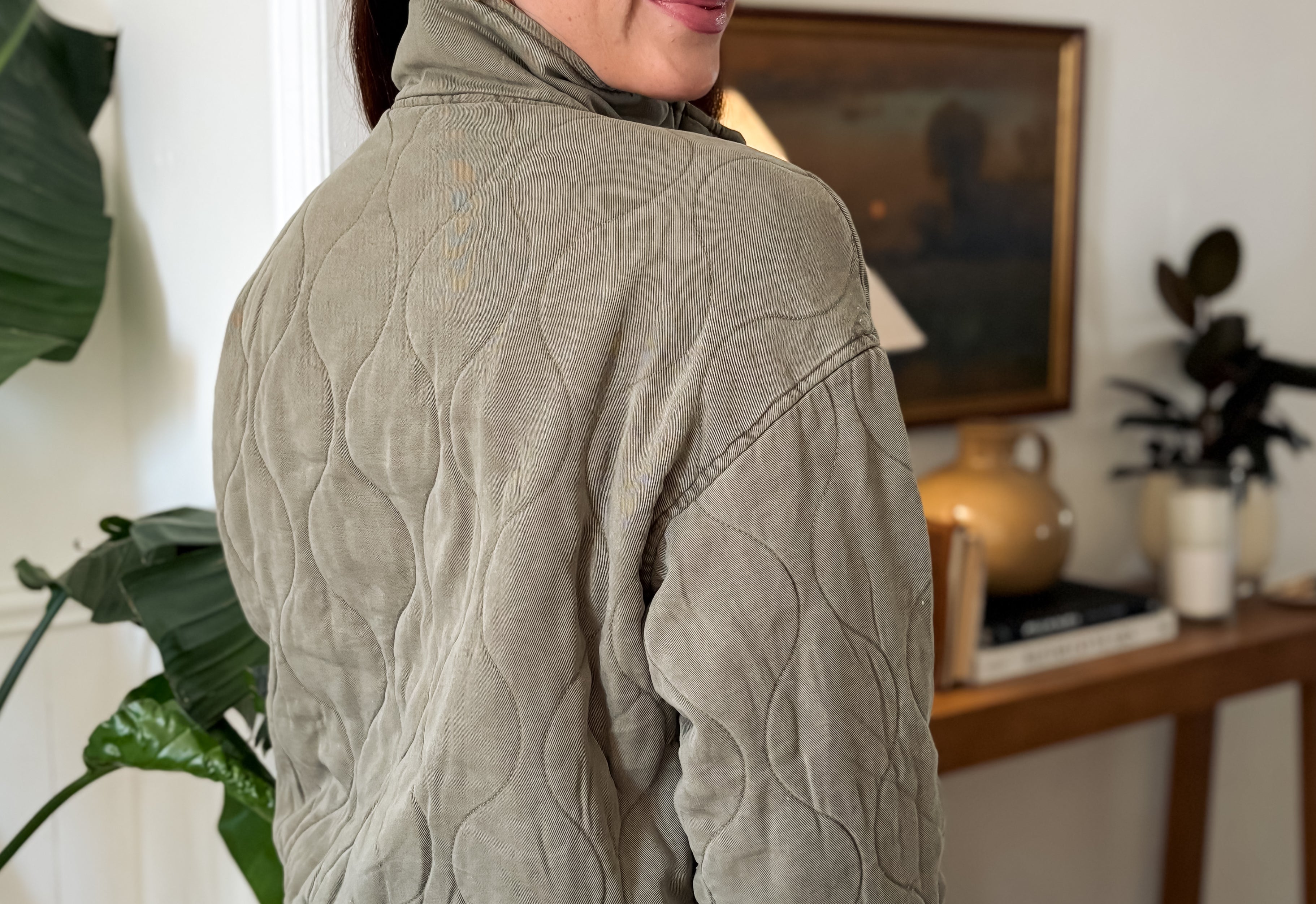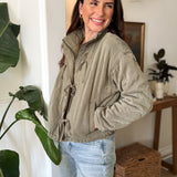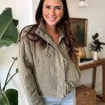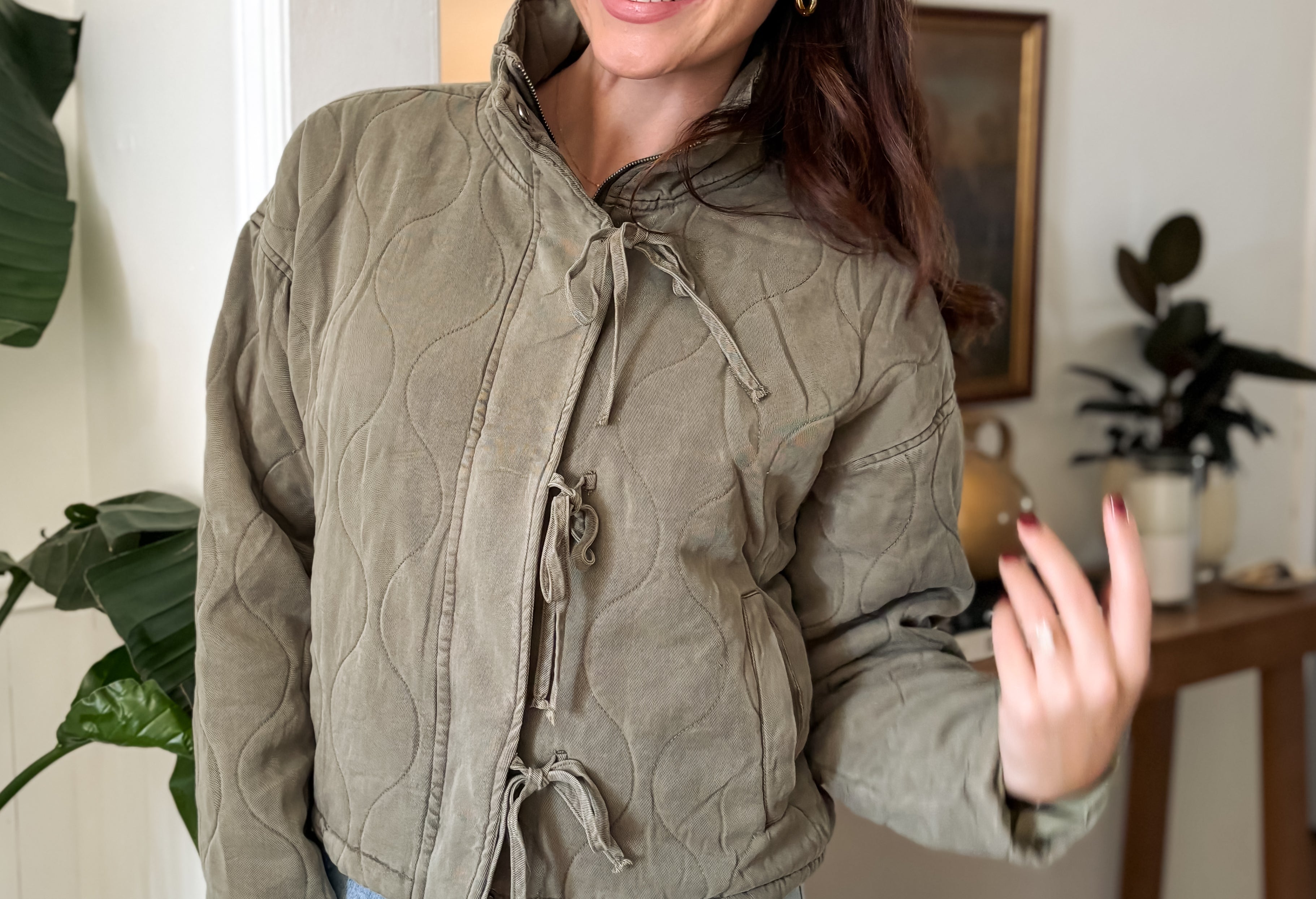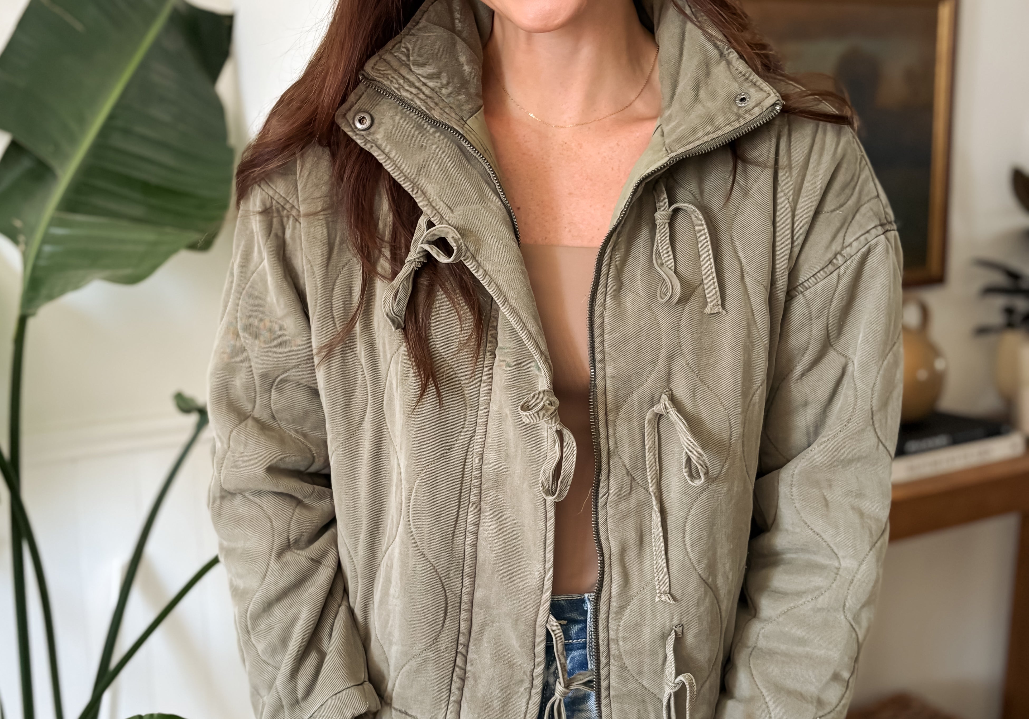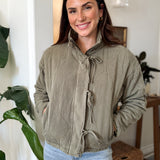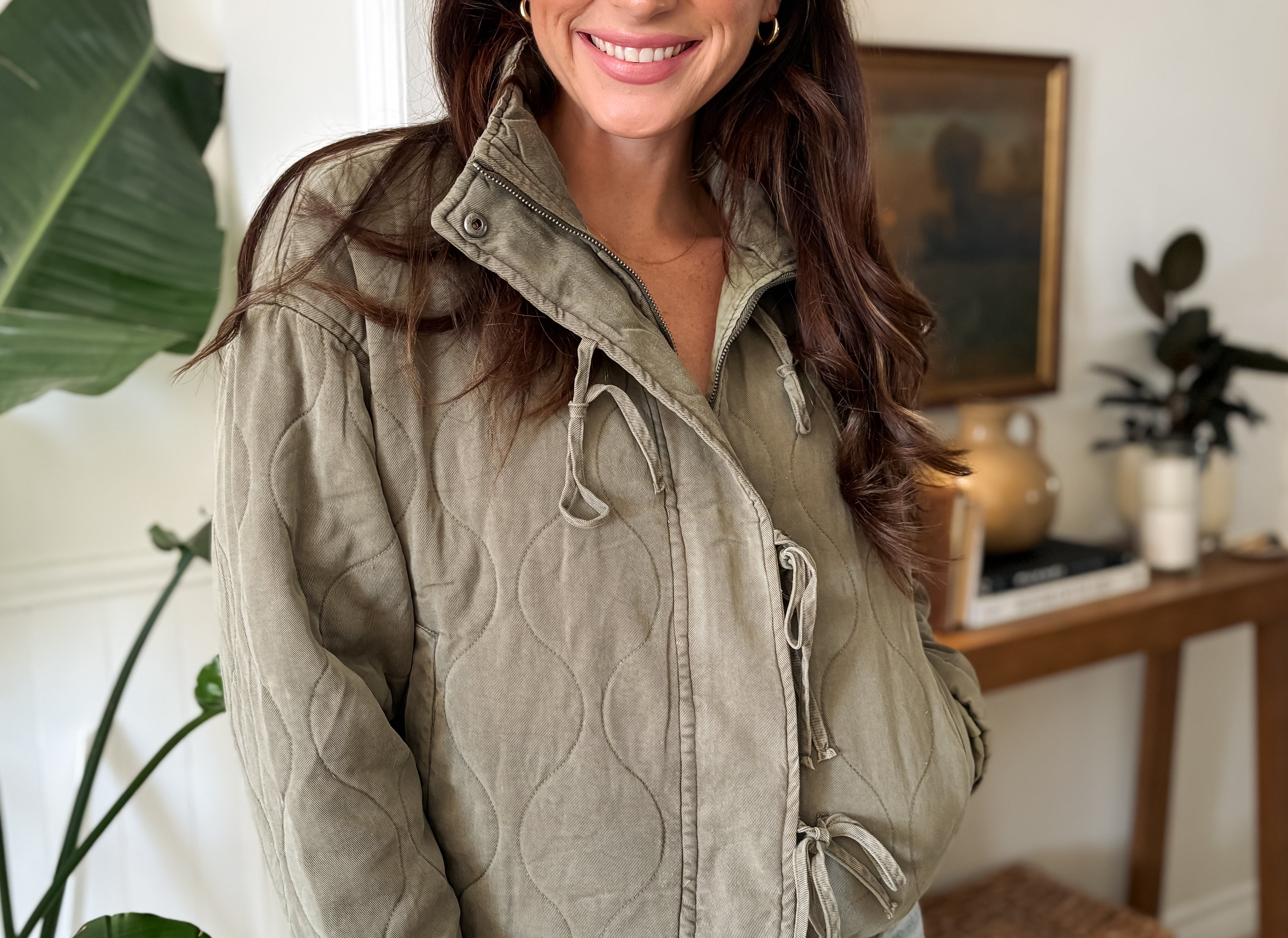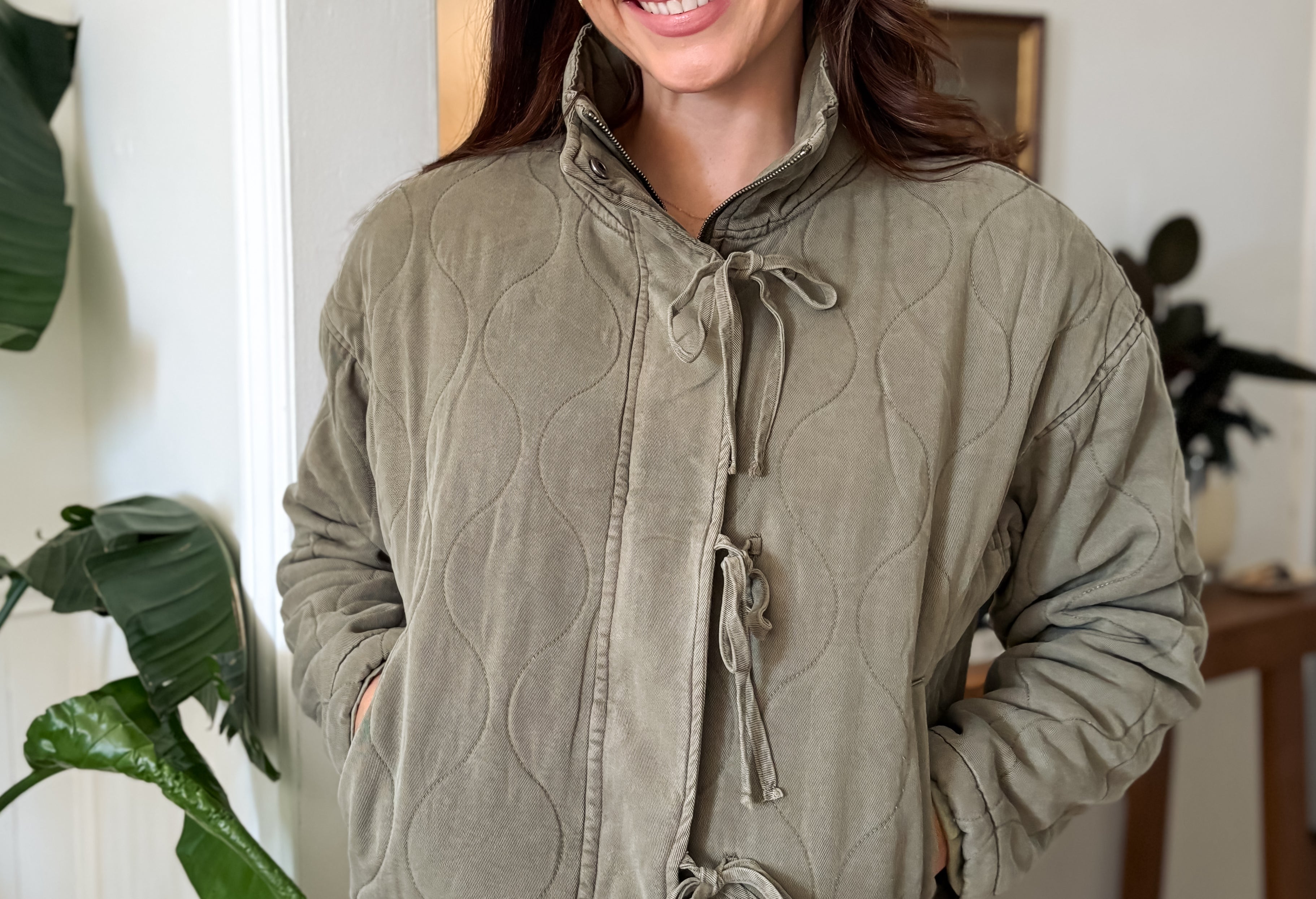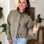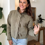 The Carla Quilted Shacked with Ties combines cozy comfort with stylish details. Featuring a soft quilted fabric in a versatile army green shade, this jacket offers a relaxed fit with adjustable tie closures. Practical pockets add convenience, while the classic lapel enhances its polished look. Perfect for layering, it effortlessly blends warmth and fashion for your everyday wardrobe.