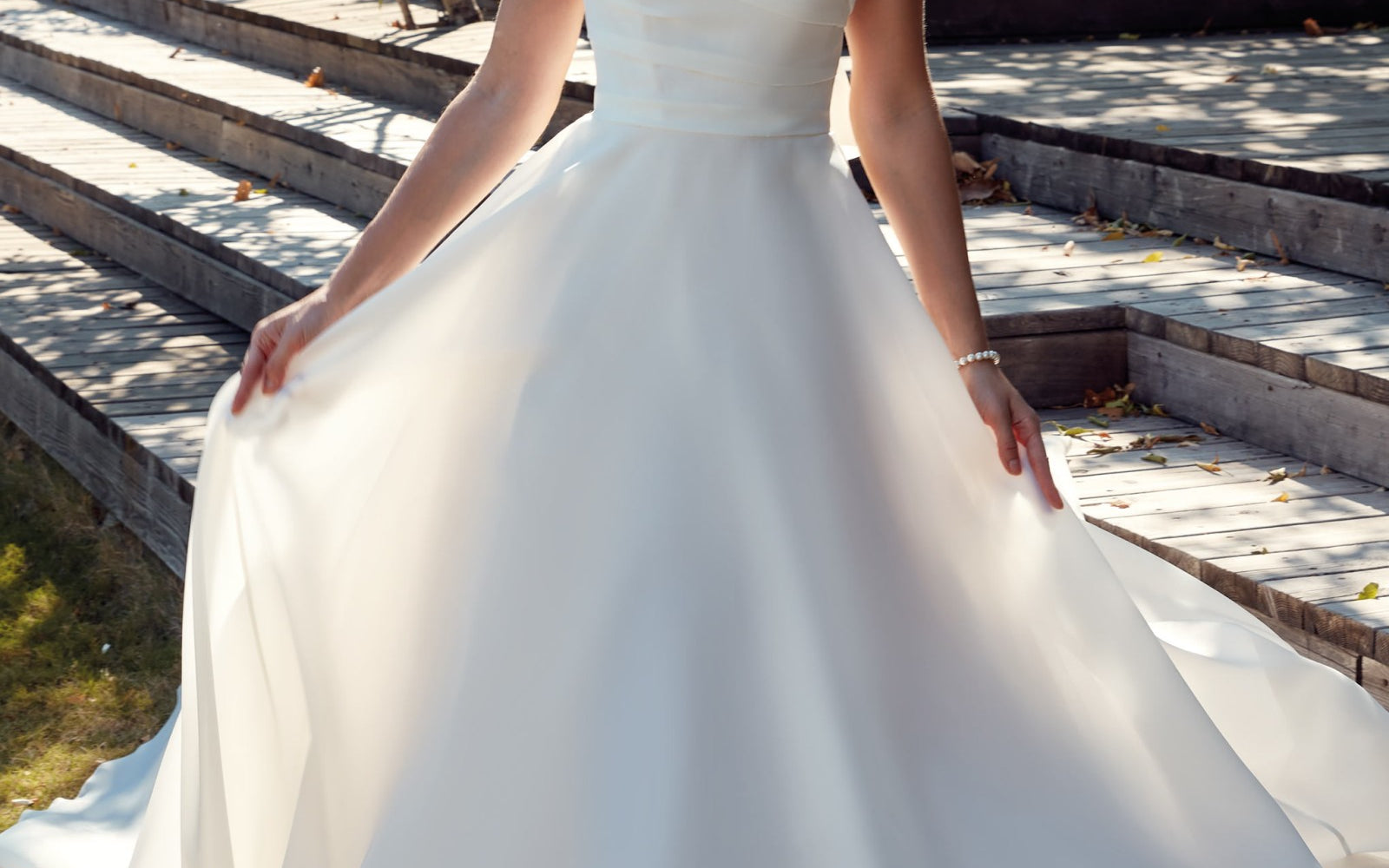 Organza ballgown with champagne tulle and dust matte lining, buttons to end of train.