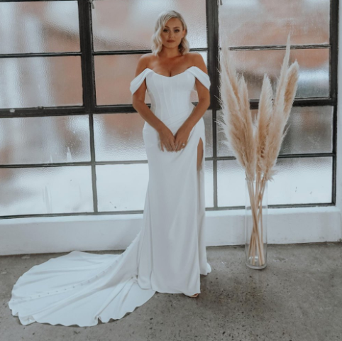 Designed in luxurious crepe with old school corset shaping and structure, this gown celebrates your curves. The leg split is optional and the off the shoulder straps are detachable. The back is finished with a zip and chapel train. Zip closure with covered buttons.