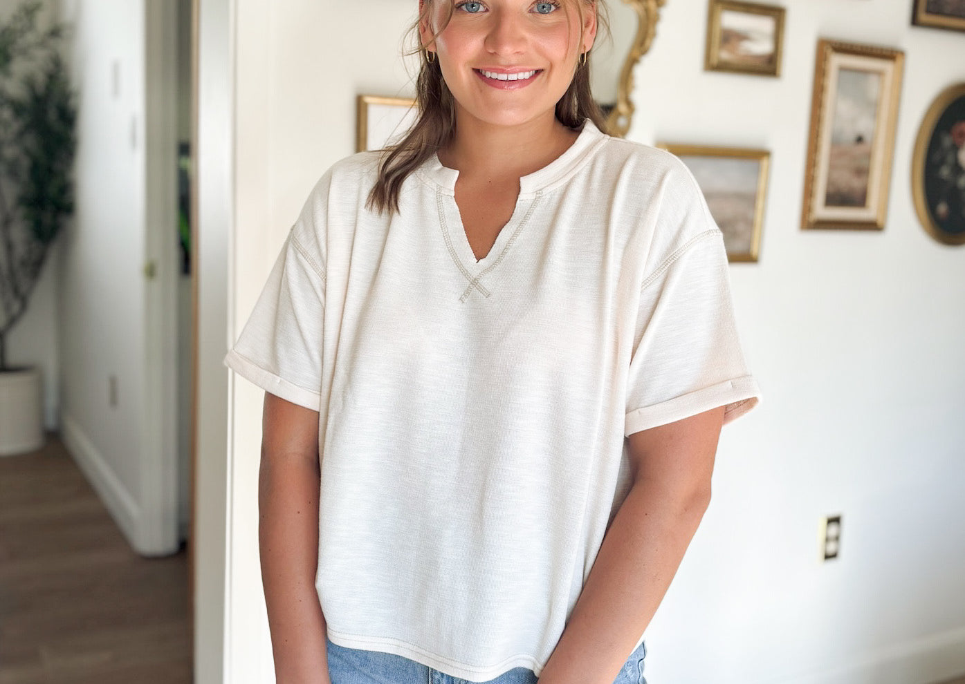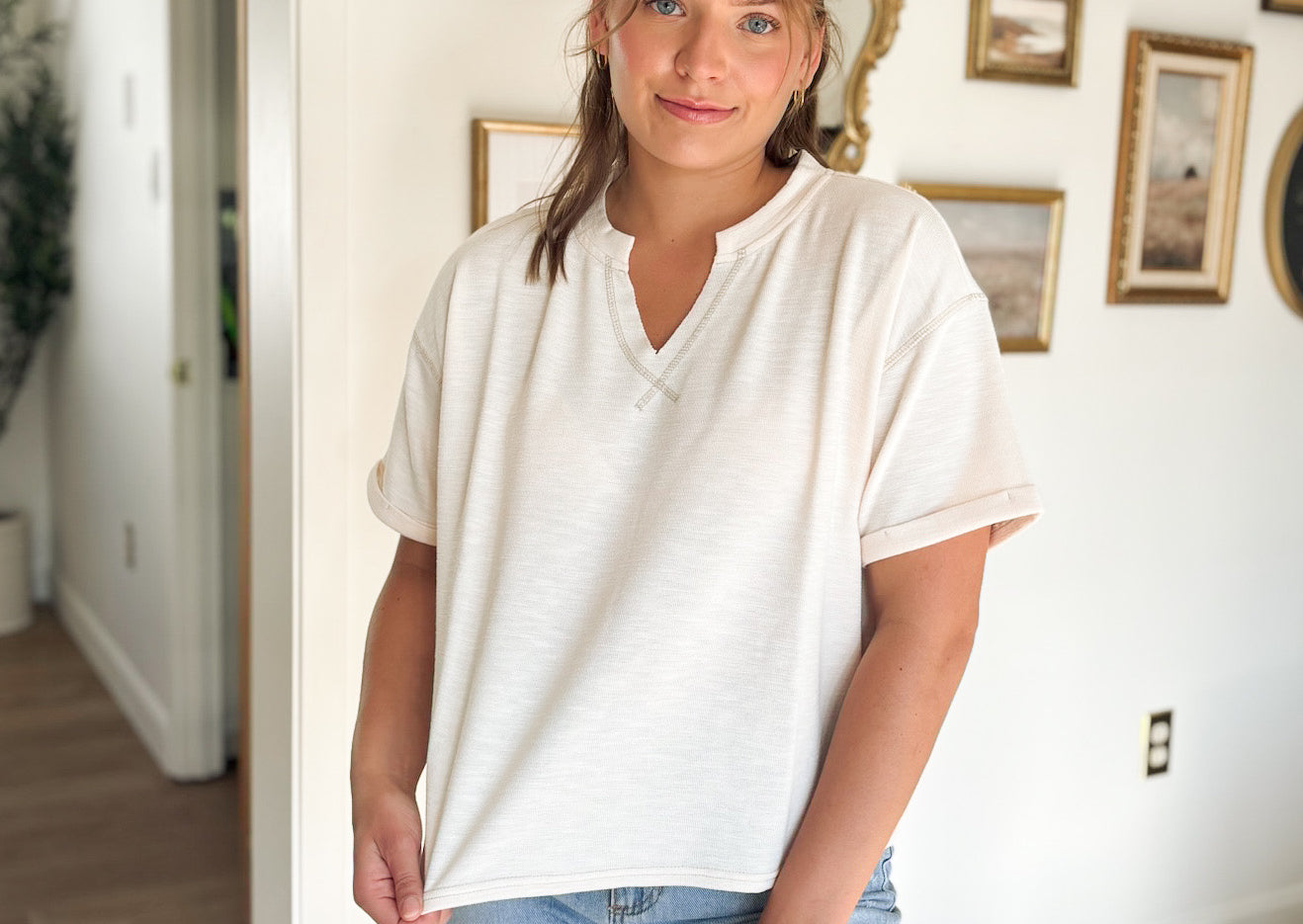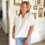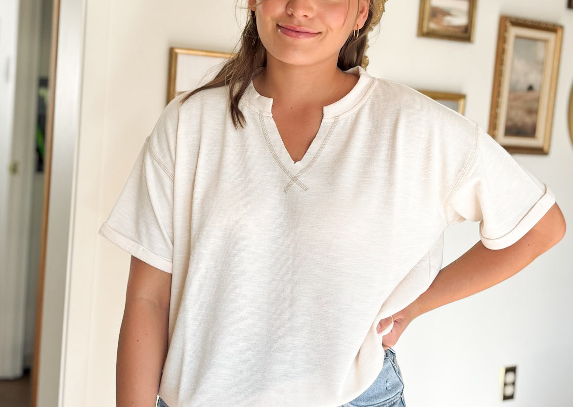 This knit top combines relaxed comfort with stylish details, featuring a flattering V neckline and short cuffed sleeves for a polished look. The drop shoulder design enhances its casual fit, while the contrast stitch adds a unique touch to the solid fabric. Perfect for effortless everyday wear, it offers breathability without lining, keeping you cool and comfortable all day.
