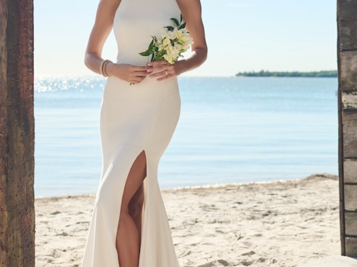 Chic halter neckline wedding gown with a side slit, sexy open back, and crepe fabric. Ask any fashionista, from any decade, for any chic celebration of love and they'd agree — this halter neckline wedding gown with a side slit is the key to chic and effortless charm.