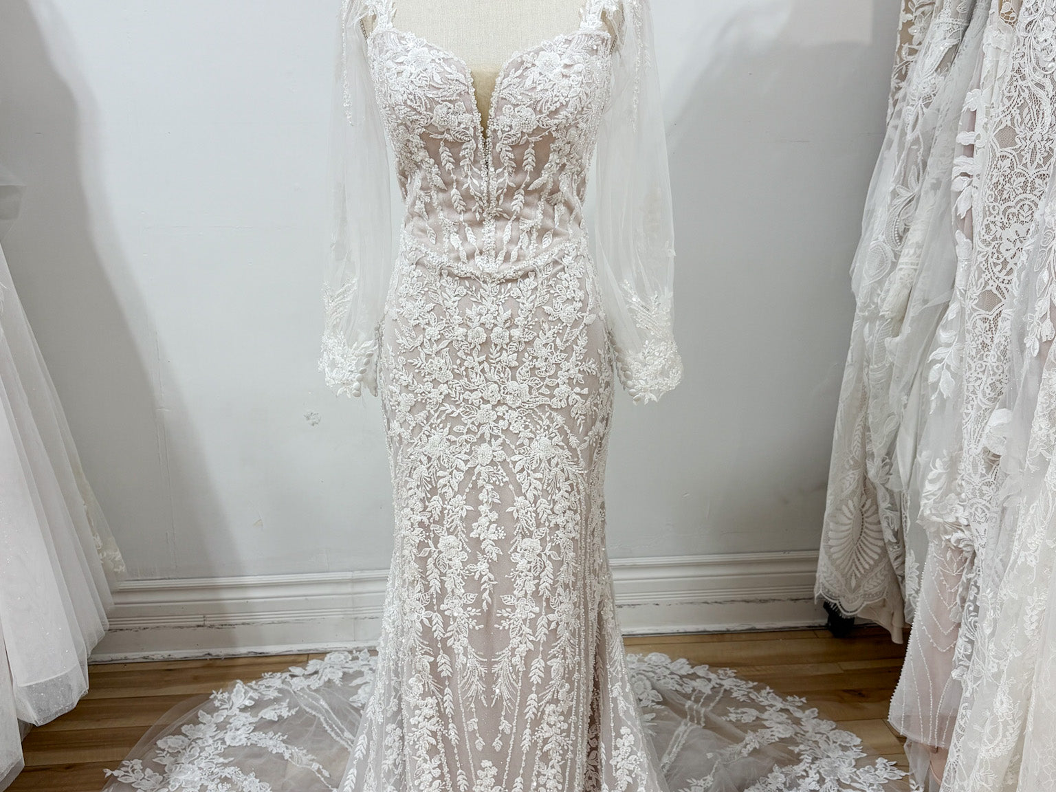 This elegant fit and flare dress features a flattering Basque waistline and fully beaded details that catch the light beautifully. The blush underlay adds a soft, romantic touch, while removable long sleeves offer versatile styling options. Available in a range of undertones, this dress is designed to complement various skin tones, ensuring a perfect, personalized look for your wedding day.