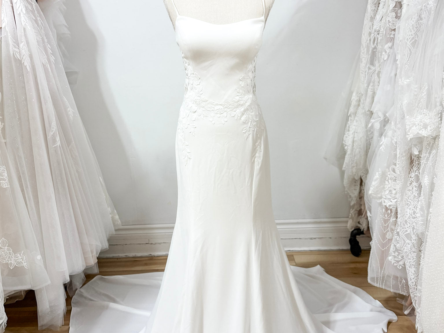 The Denver dress is a stunning fit-and-flare wedding gown crafted from elegant crepe fabric. It features a flattering scoop neckline and delicate spaghetti straps, enhancing your natural silhouette. Intricate lace panels with tasteful openings on each side of the bodice add a touch of allure, while illusion tulle accents bring a subtle, modern sophistication. Designed to celebrate your special day with grace and style, this dress perfectly balances romance and contemporary charm.