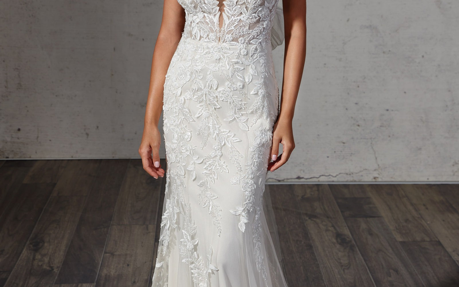 Fit-n-Flare gown with beaded ivory lace with sequins over champagne tulle, sand stretchy lining, champagne unlined bodice, champagne tulle back bow, beaded straps, skin cleavage, buttons over zipper.