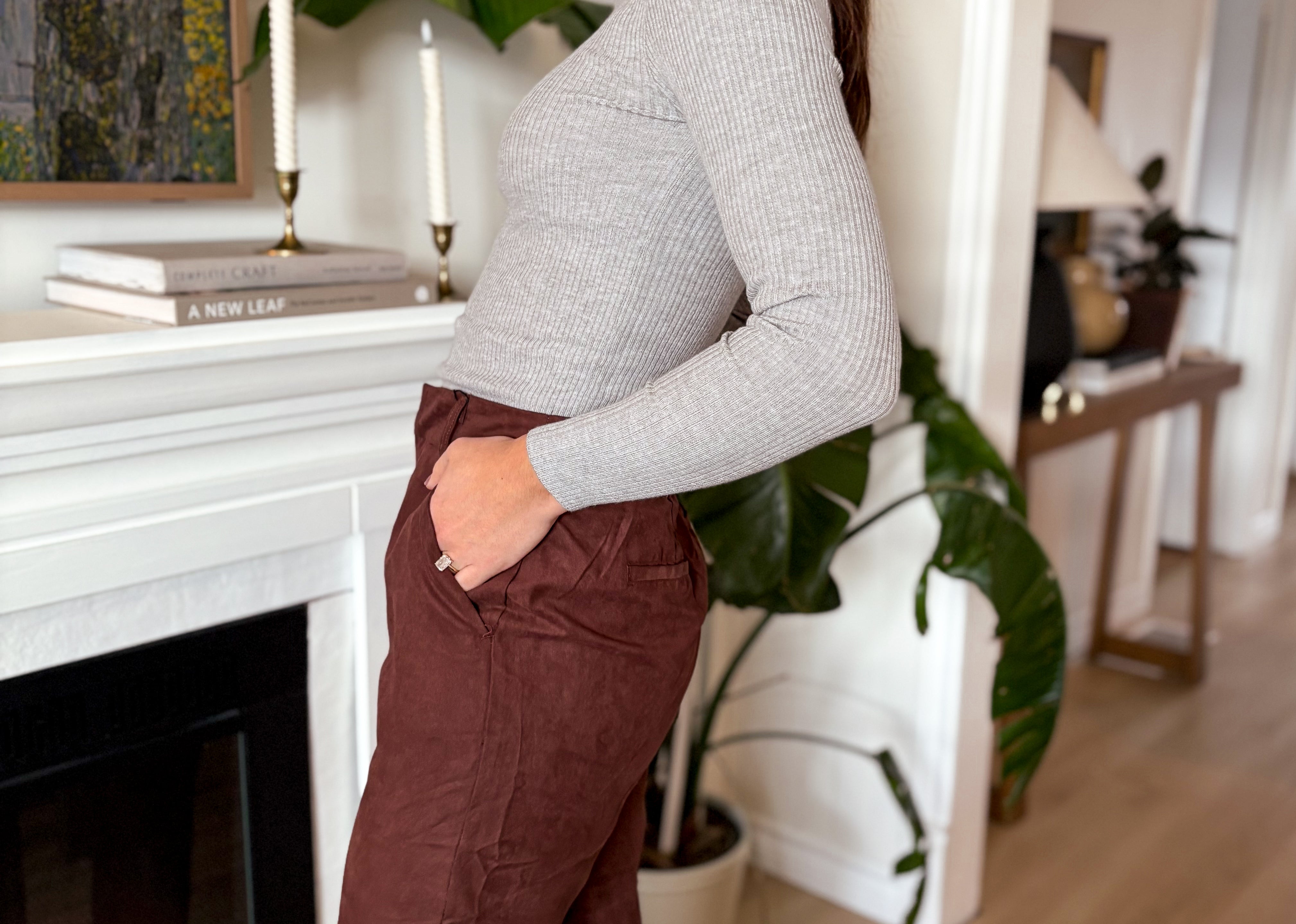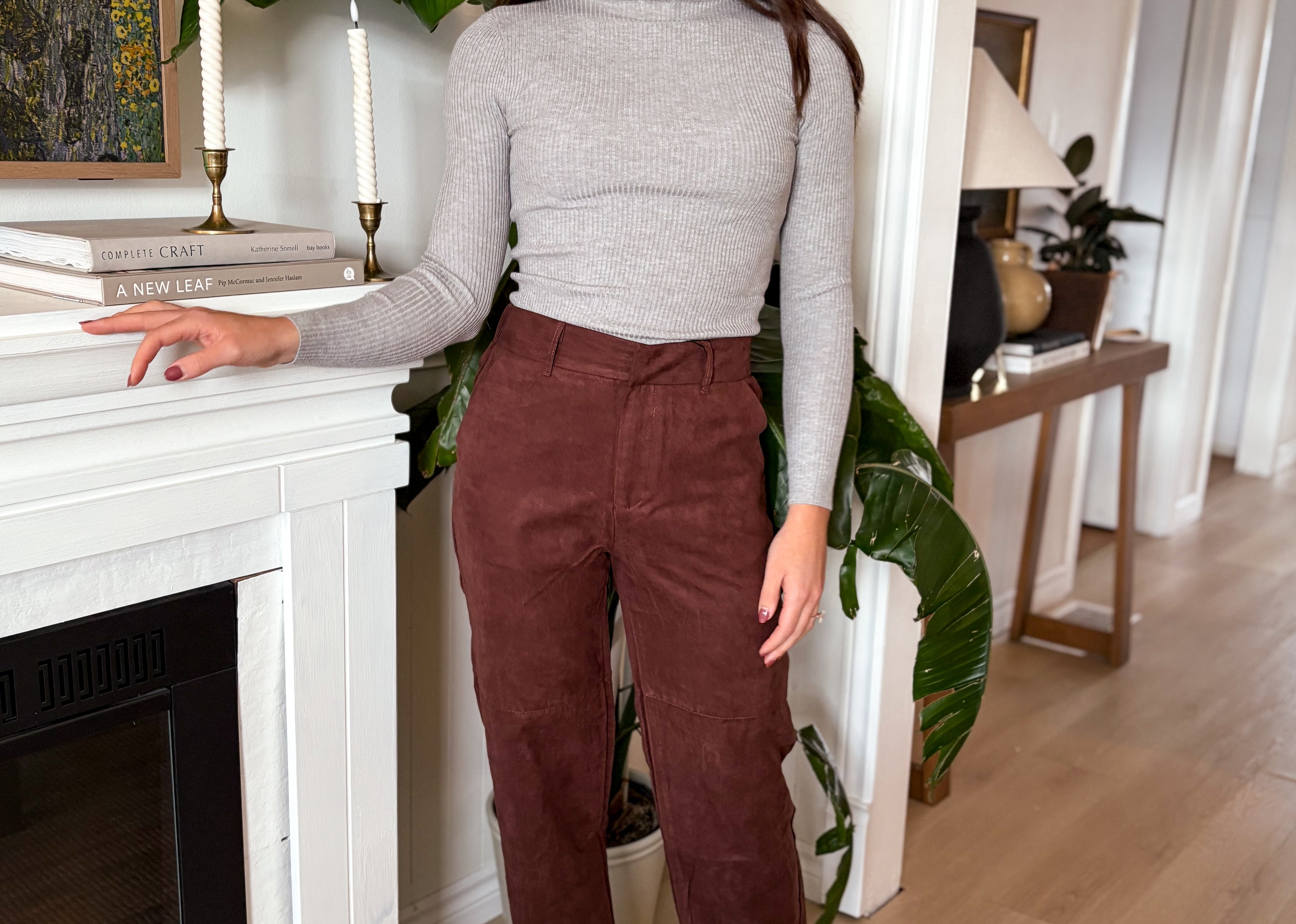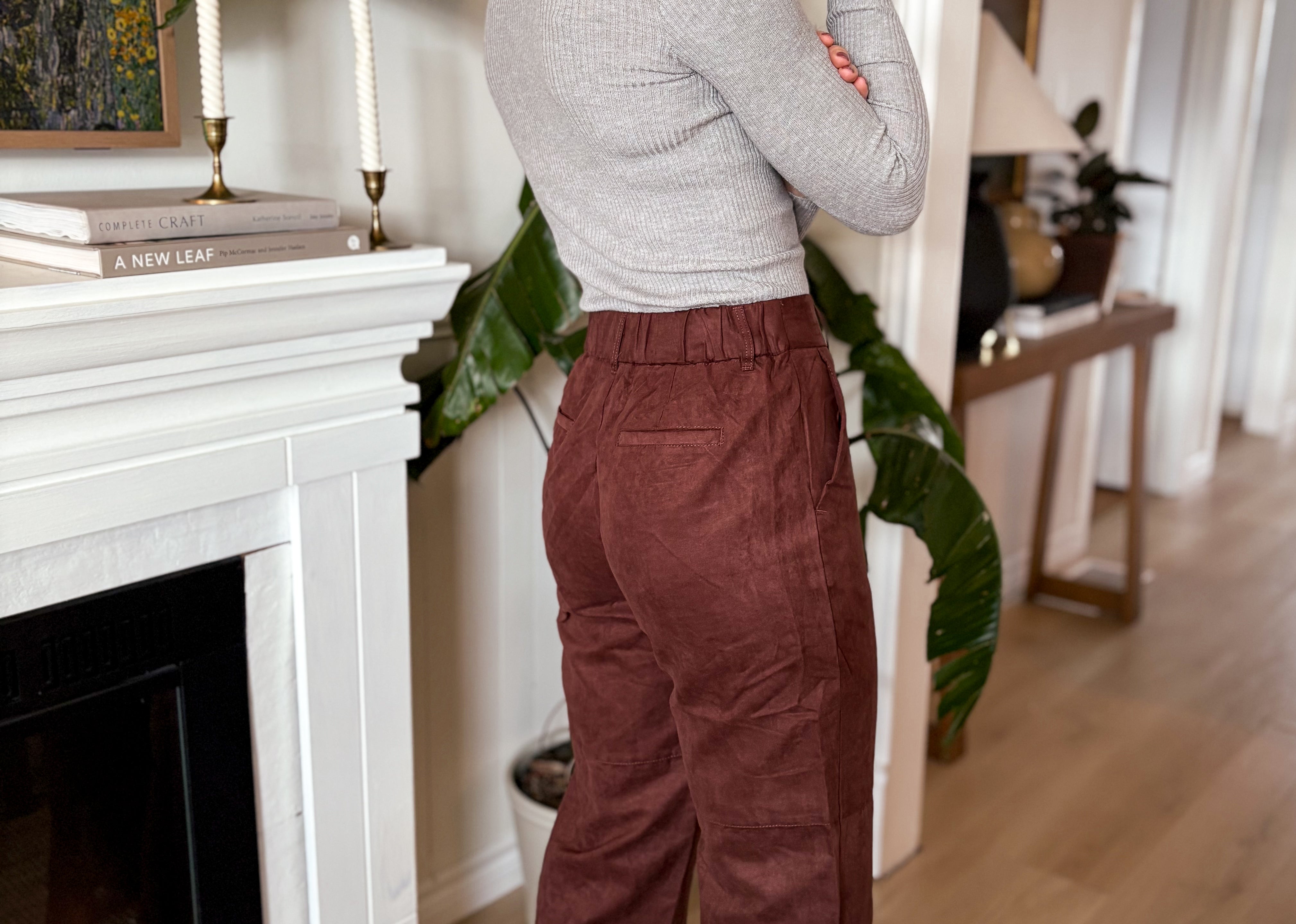 The Cassie Faux Suede Straight Leg Woven Pants in Dark Brown