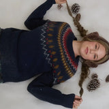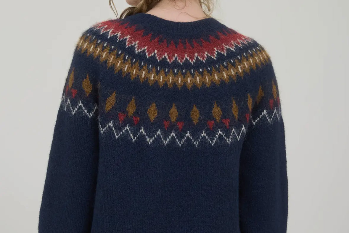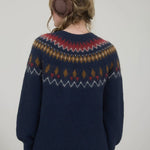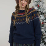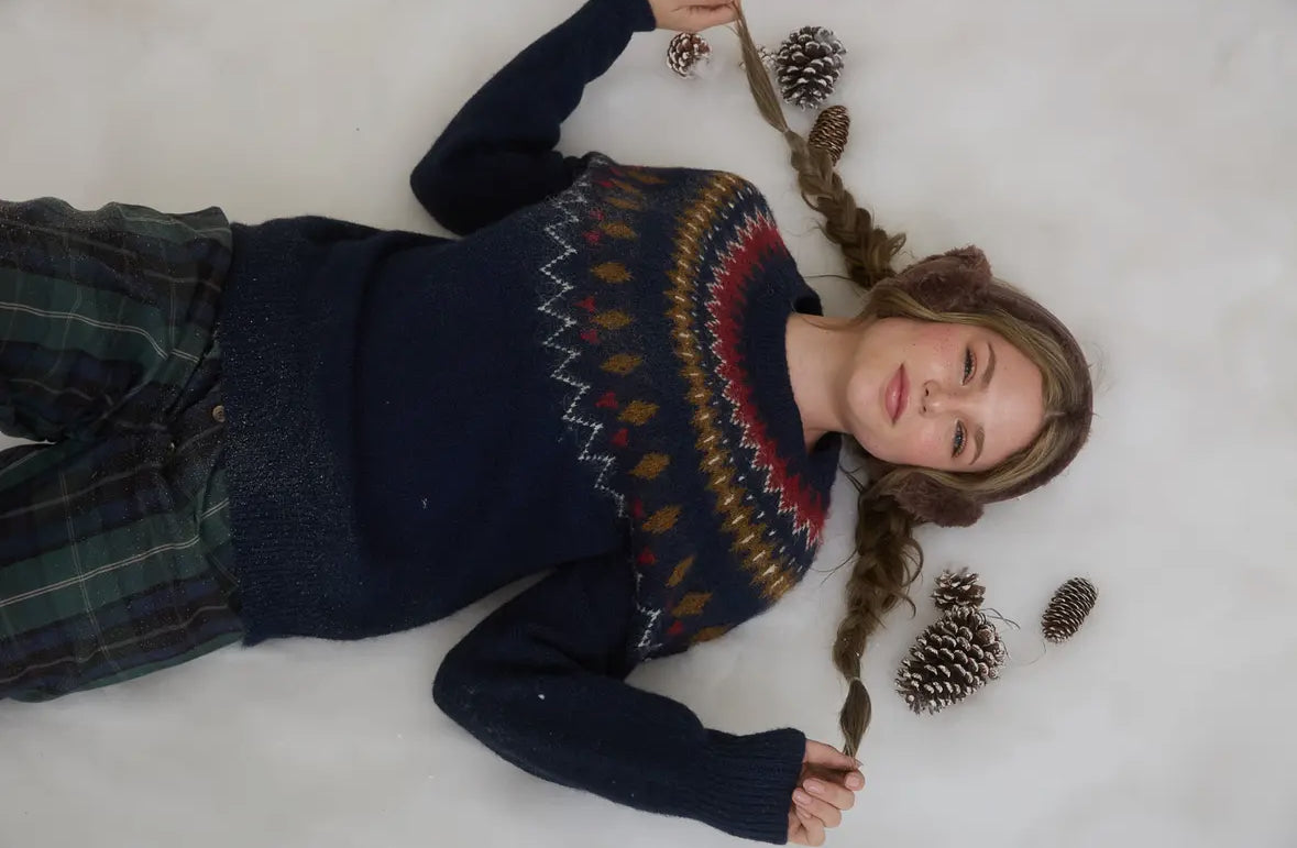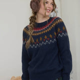 Fuzzy Fair Isle Crew Neck Knit Pullover Sweater in Navy