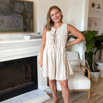Elevate your wardrobe with the Harriet Tie Up Dress, featuring a flattering pleated bodice and a chic double tie-up design. This sleeveless, khaki dress offers a sophisticated v-neck silhouette and falls gracefully to the knee, making it perfect for both casual outings and special occasions. Its tailored fit enhances your shape while providing comfort and style all day long.