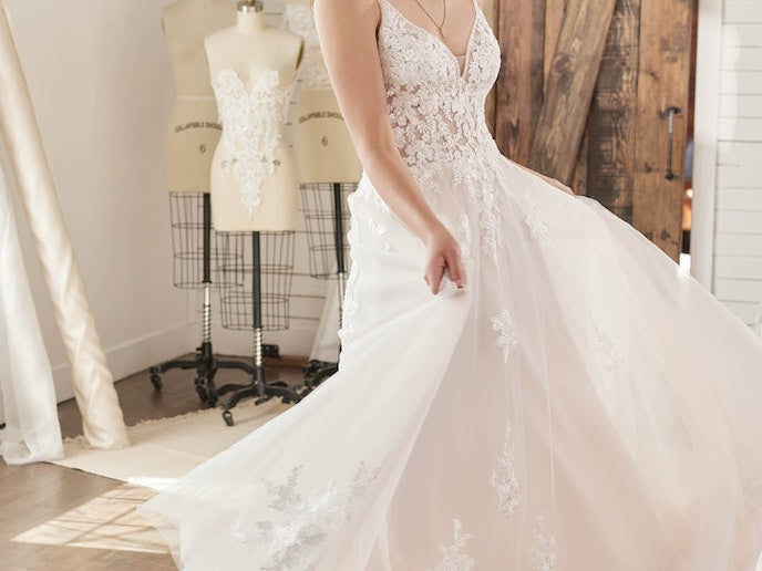 If you and the crew are jet-setting to a summery locale for your nuptials, pack this garden-inspired A-Line bridal dress for a soft and radiant bridal vibe.