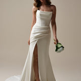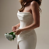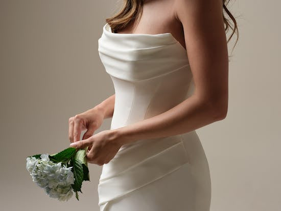 There's something very "modern renaissance" about this Basque waist crepe cowl wedding dress.