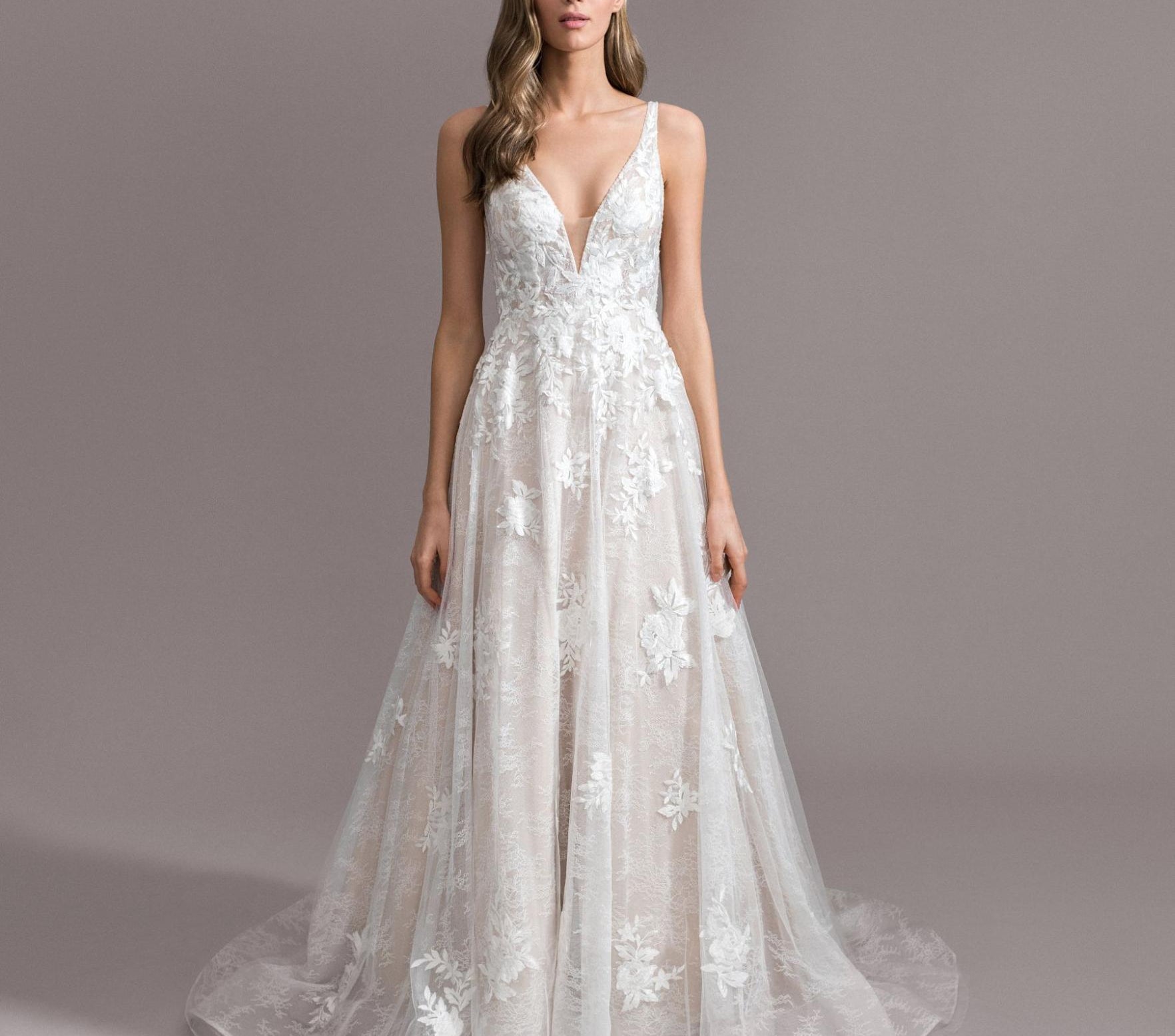 Ivory/Cashmere lace and English net A-Line gown. Deep V-neck sheer bodice with sheer v back and button detailing.