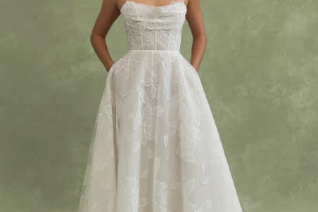 The Lorelai gown, crafted in our airy organza fabric with dramatically oversized floral appliques makes a perfectly romantic statement. She is light as a feather, but her beautifully draped bodice sits on a fully boned corset that gives you an incredibly well sculpted silhouette.