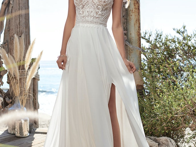 Hot dang-soft and dreamy makes a major statement in this V-neck chiffon sheath wedding dress. (Plus it's light and breathable for all kinds of weather.