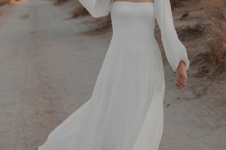 The Louise wedding dress is as chic as she is romantic. Cut in our luxe chiffon fabric, the sleek square neckline balanced by beautifully dramatic, voluminous long sleeves. Elastic shoulders and cuffs lend the sleeves comfort and versatility. The structured bodice gives way to a full, flowing A-line skirt for a classic and flattering silhouette.