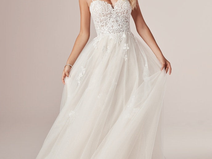 A quick lesson in modern fairytale-ing: a princess gown need not weigh a ton to feel like magic. Consider this romantic A-Line wedding dress in soft shimmer and lightweight lace.