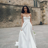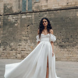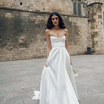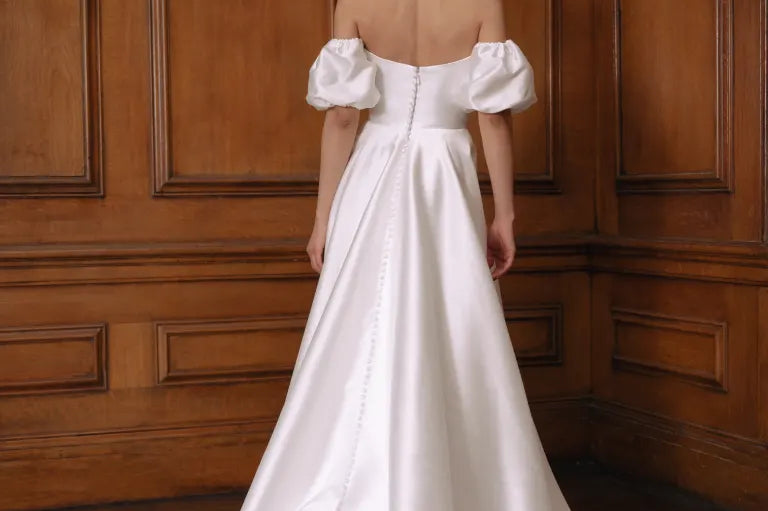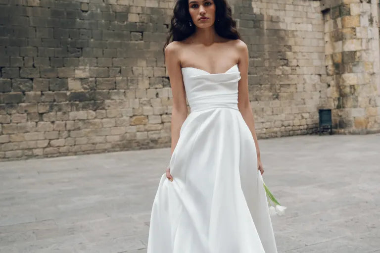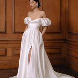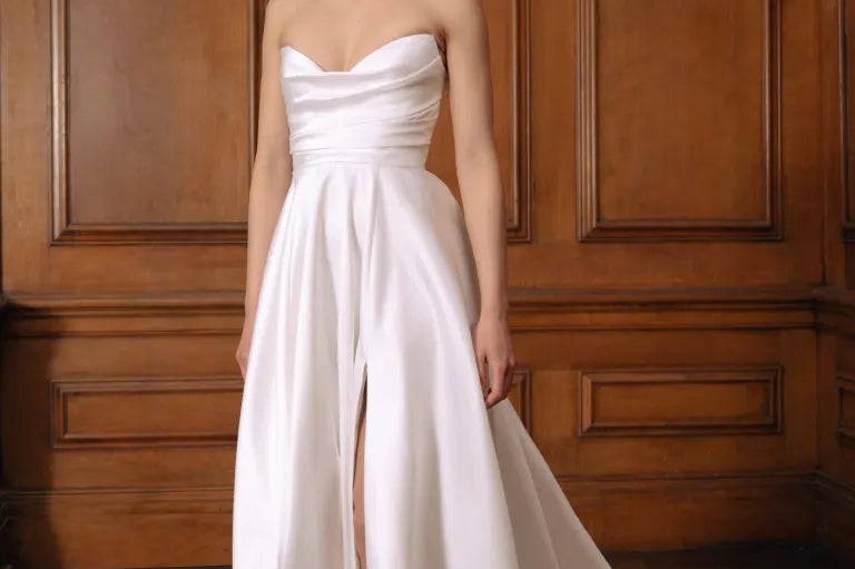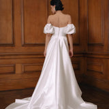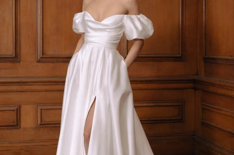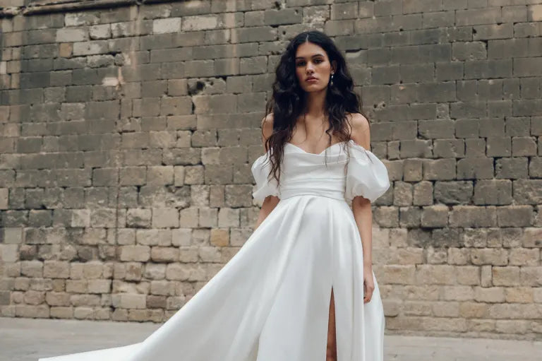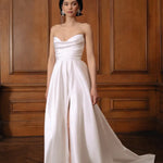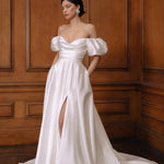 The Marisol gown features a beautifully draped bodice with a sultry, sculpted cowl neckline. A slit interrupts the otherwise classic ball skirt and adds a flirty detail. The detachable puff sleeves offer feminine coverage and versatility.