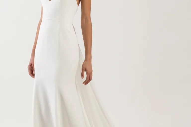The Marley V-neck bridal gown is as chic as she is simple. The classic fit and flare silhouette effortlessly flatters your curves, and the bodice tapers up to a delicate spaghetti strap to highlight your shoulders beautifully. The open back gives way to a chiffon tie that lends a dramatic finish to this modern gown.