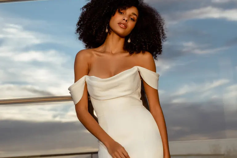 The Meredith bridal gown features elegantly draped sleeves and cowl neckline. Thoughtful architectural seam details flatter the figure and elevate the dramatic fit and flare silhouette. Covered buttons down the back of the gown add a classic bridal detail.