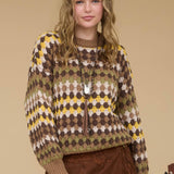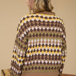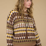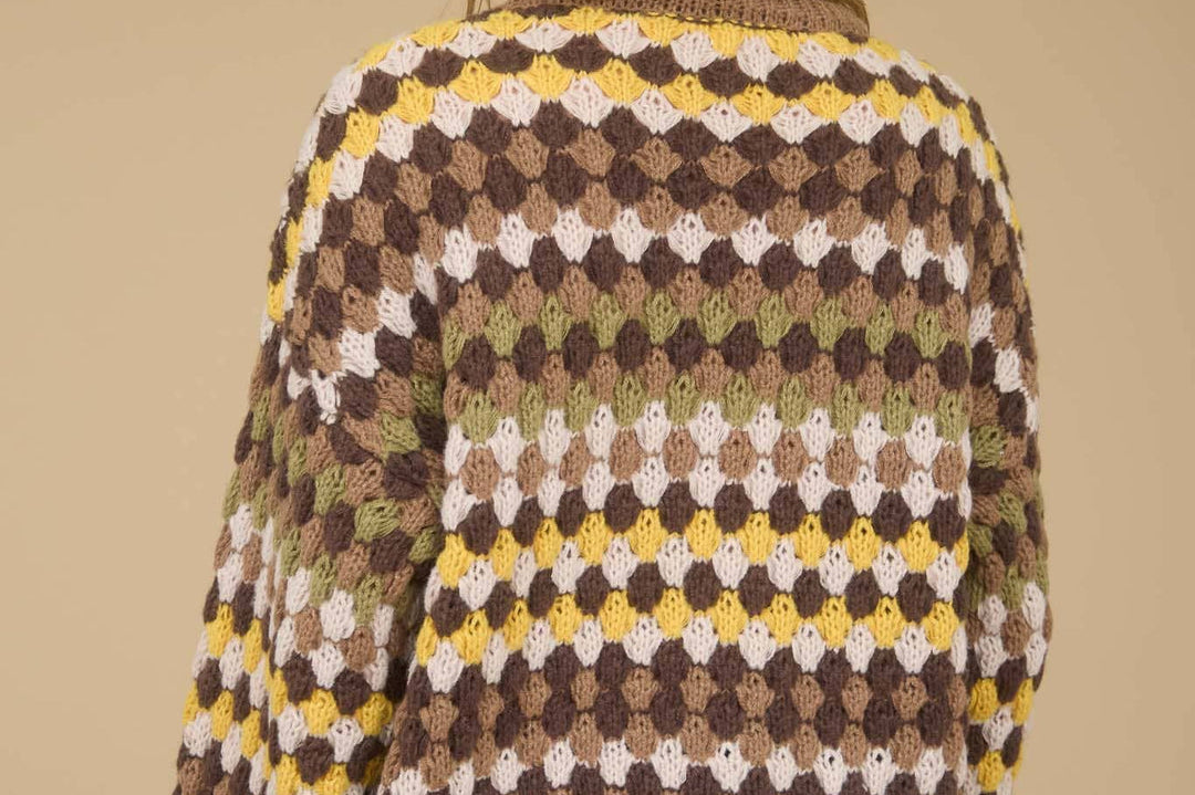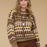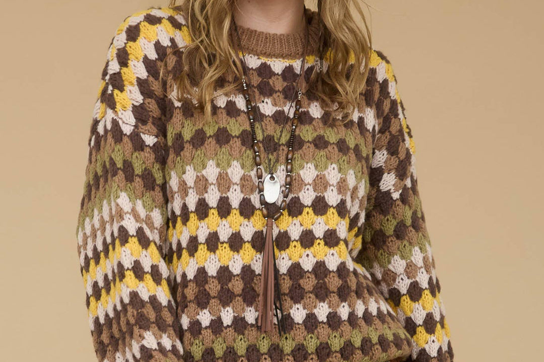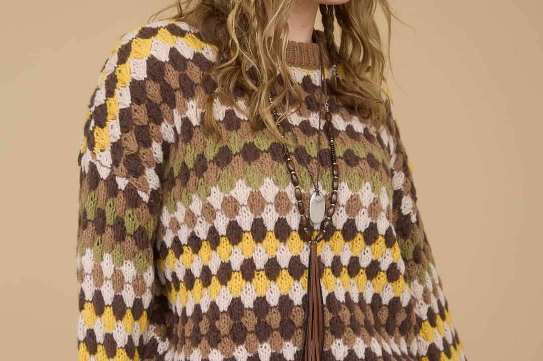 Elevate your everyday wardrobe with this stunning multicolor knit crewneck pullover. Crafted with a timeless honeycomb texture, this sweater seamlessly blends warm neutrals—cream, brown, and taupe—with vibrant pops of olive green and mustard yellow for a look that's both sophisticated and eye-catching. The classic round neckline features ribbed detailing for a polished finish and comfortable fit. Perfect for layering or wearing solo, this versatile piece transitions effortlessly from season to season, adding depth and character to any outfit.