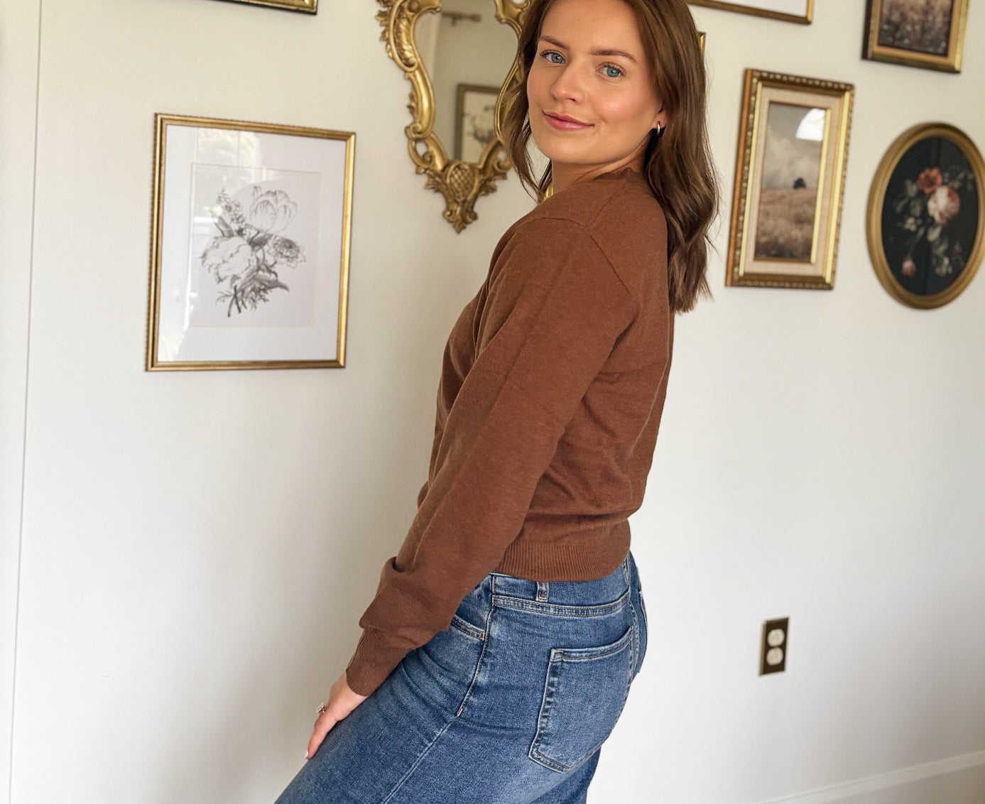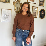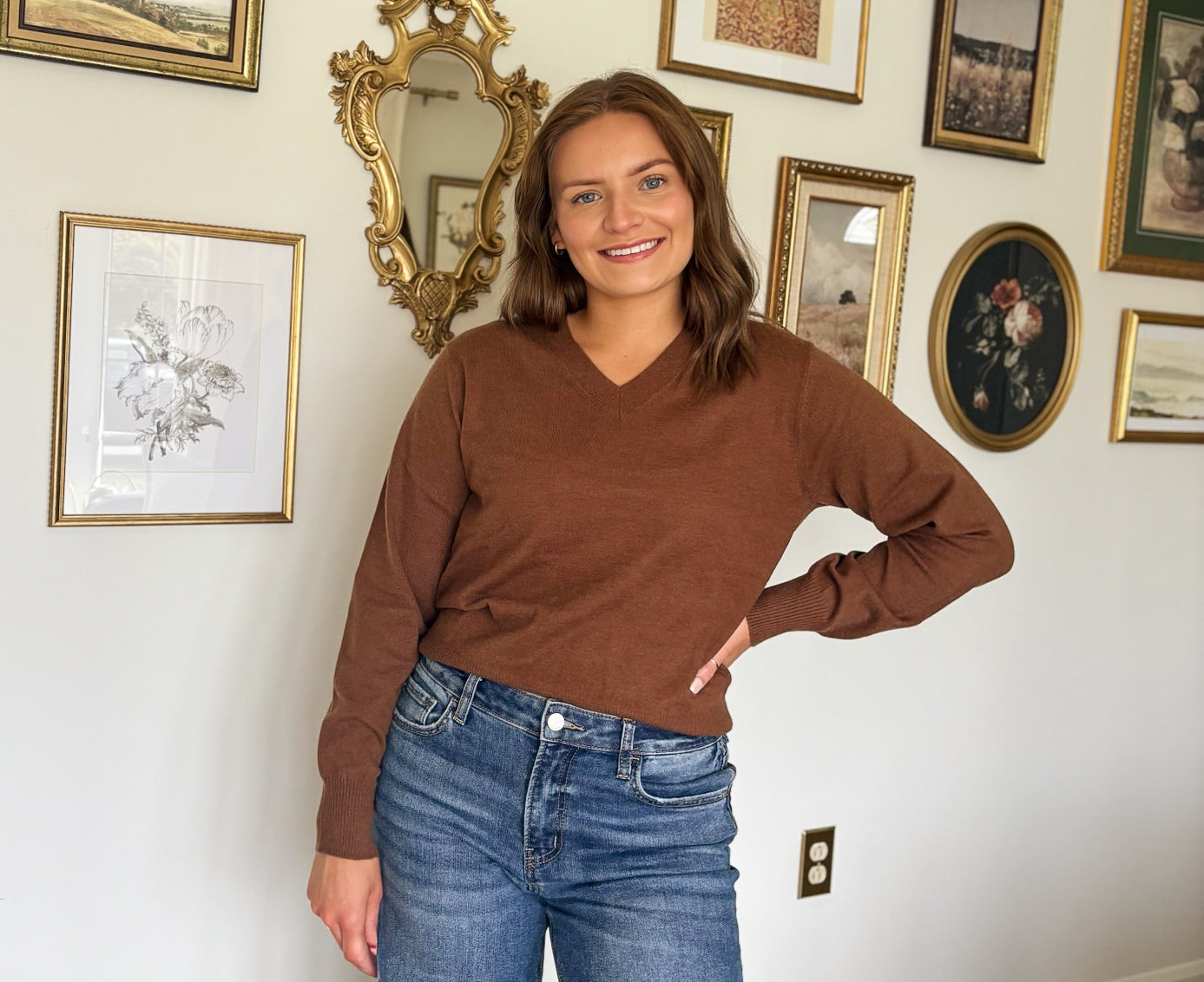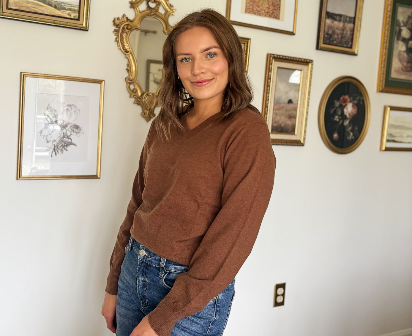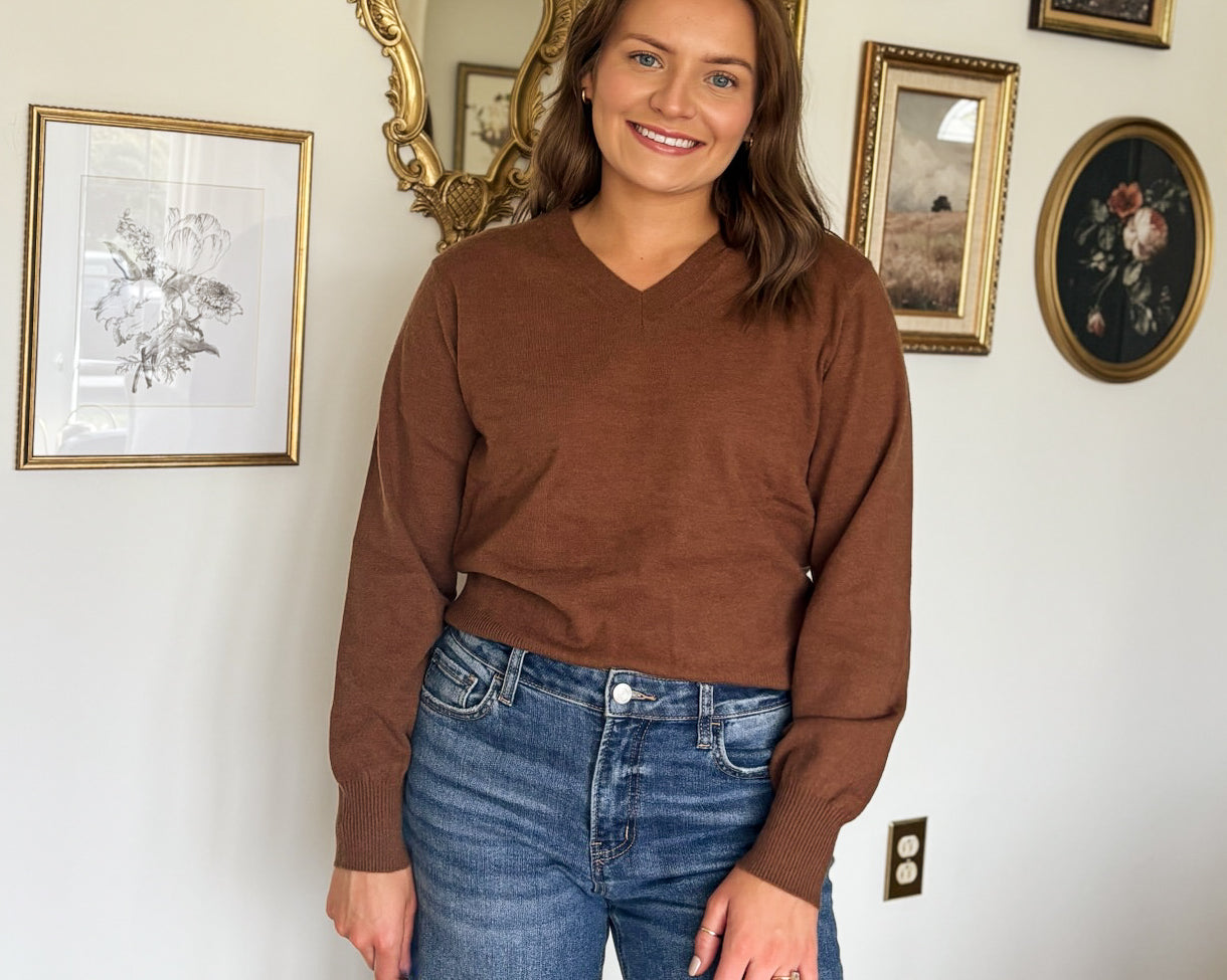 Experience luxury and comfort with the Naomi V-Neck Pullover. This buttery soft, camel-coloured sweater shirt features a flattering V-neck and long sleeves. The woven knit and stretch fabric creates a soft and lightweight feel, making it perfect for any occasion. Elevate your wardrobe with this must-have piece!