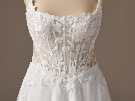 For the true-blue, unabashedly feminine and sensual soul-this A-line plunging neckline floral lace wedding dress delights with delicately unembellished straps and gorgeous bodice details from Maggie Sottero.