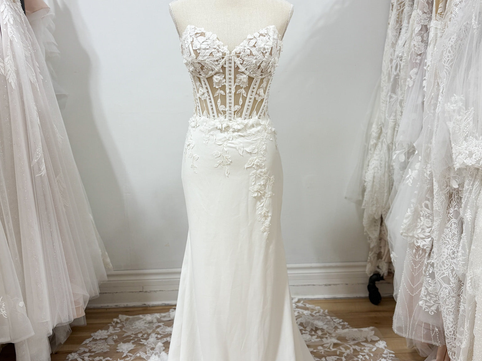 The Reese bridal gown elegantly blends modern design with romantic details. Its fit and flare silhouette highlights your figure, featuring a crepe skirt that flows gracefully. The sheer bodice can be lined for comfort, adorned with exposed boning for structure and delicate 3D lace that extends into a stunning lace train. A sweetheart neckline and pearl accents throughout the bodice add timeless femininity, making Reese a captivating choice for your special day.