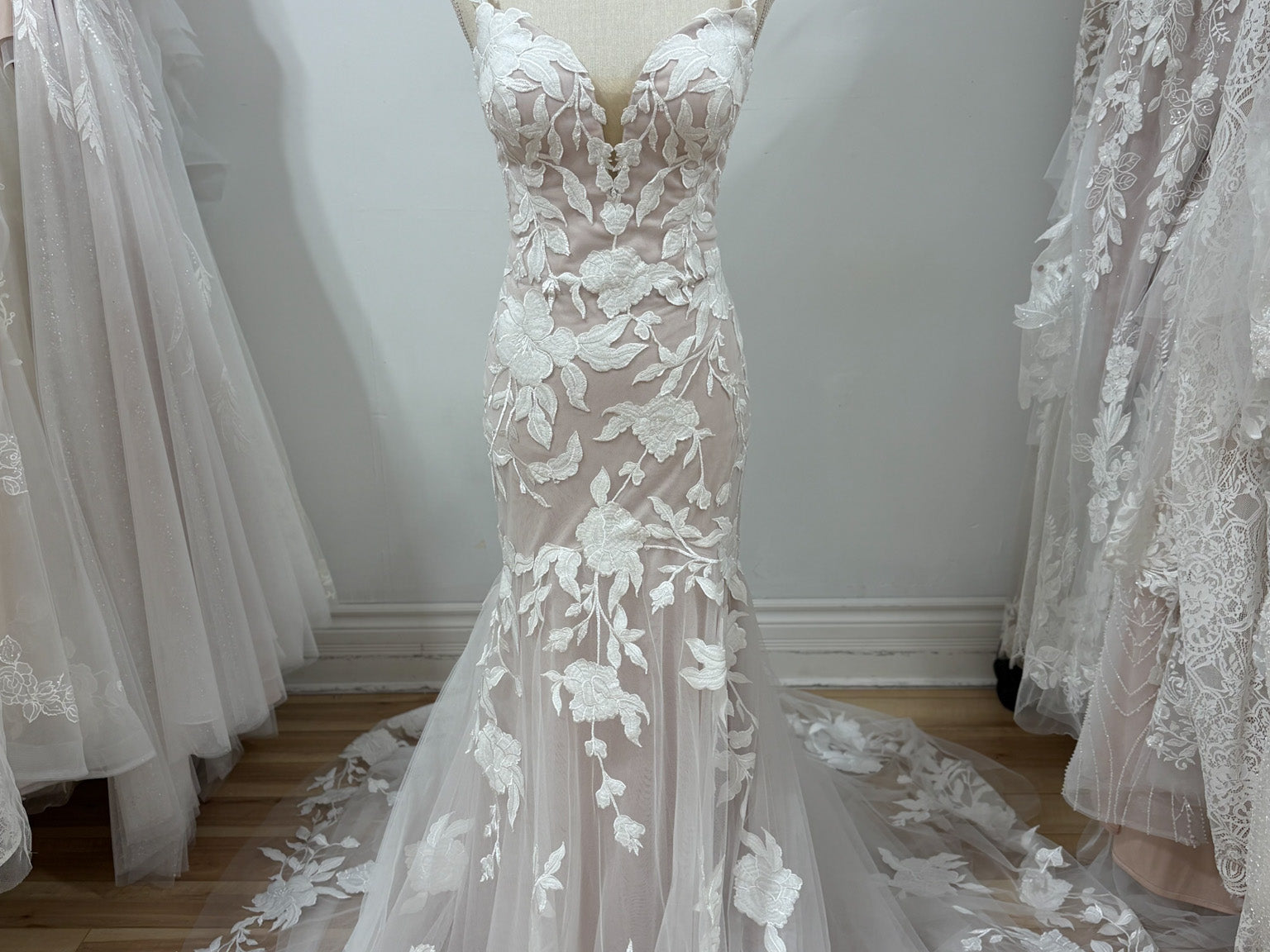 The Rose bridal dress features a romantic sweetheart neckline and delicate lace straps that frame your silhouette beautifully. Its floral lace overlay with a soft blush underlay adds a subtle touch of color and elegance. Designed with a flattering fit-and-flare silhouette, this gown enhances your natural curves for a graceful and timeless look on your special day.