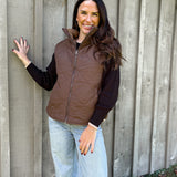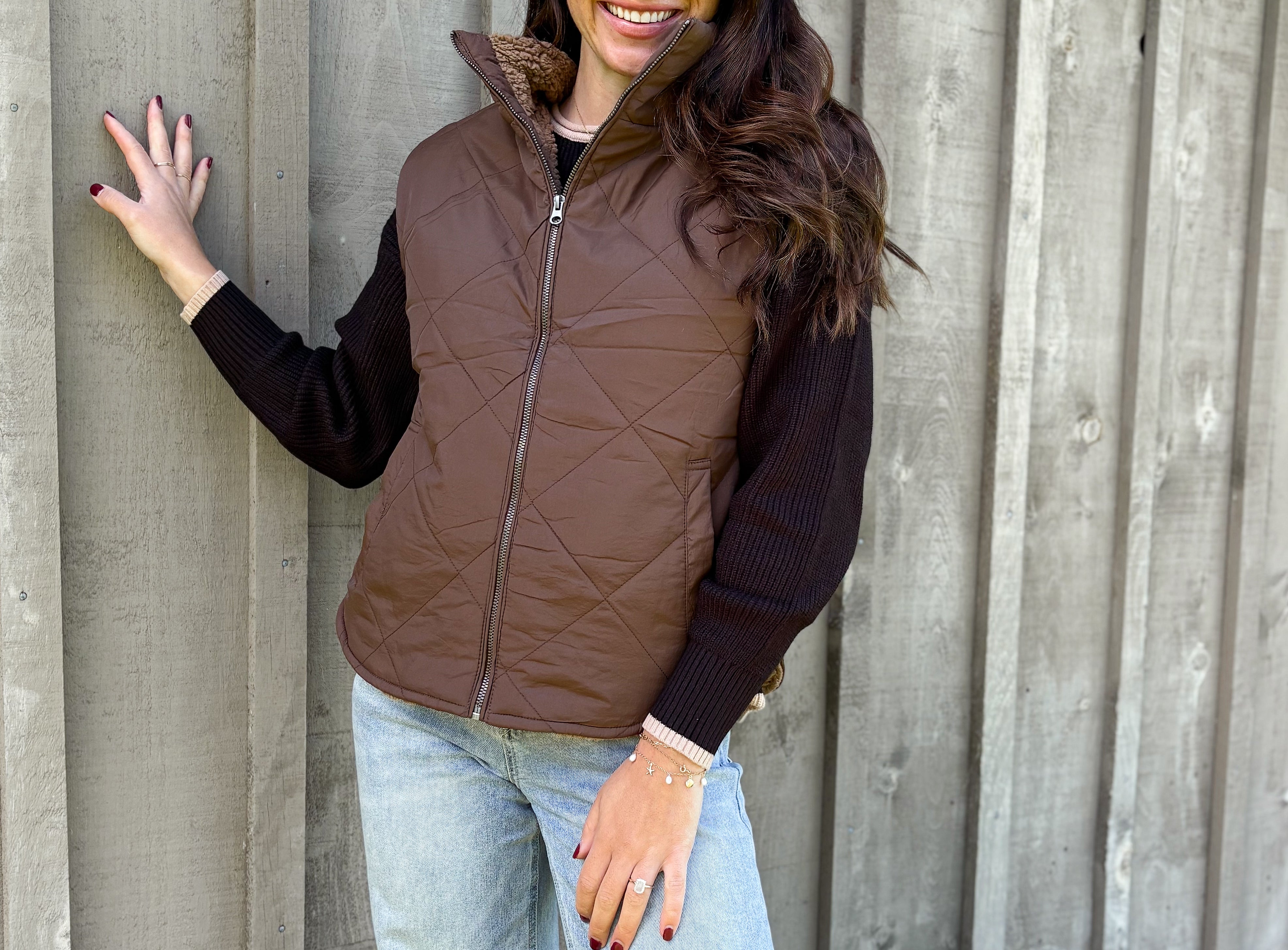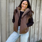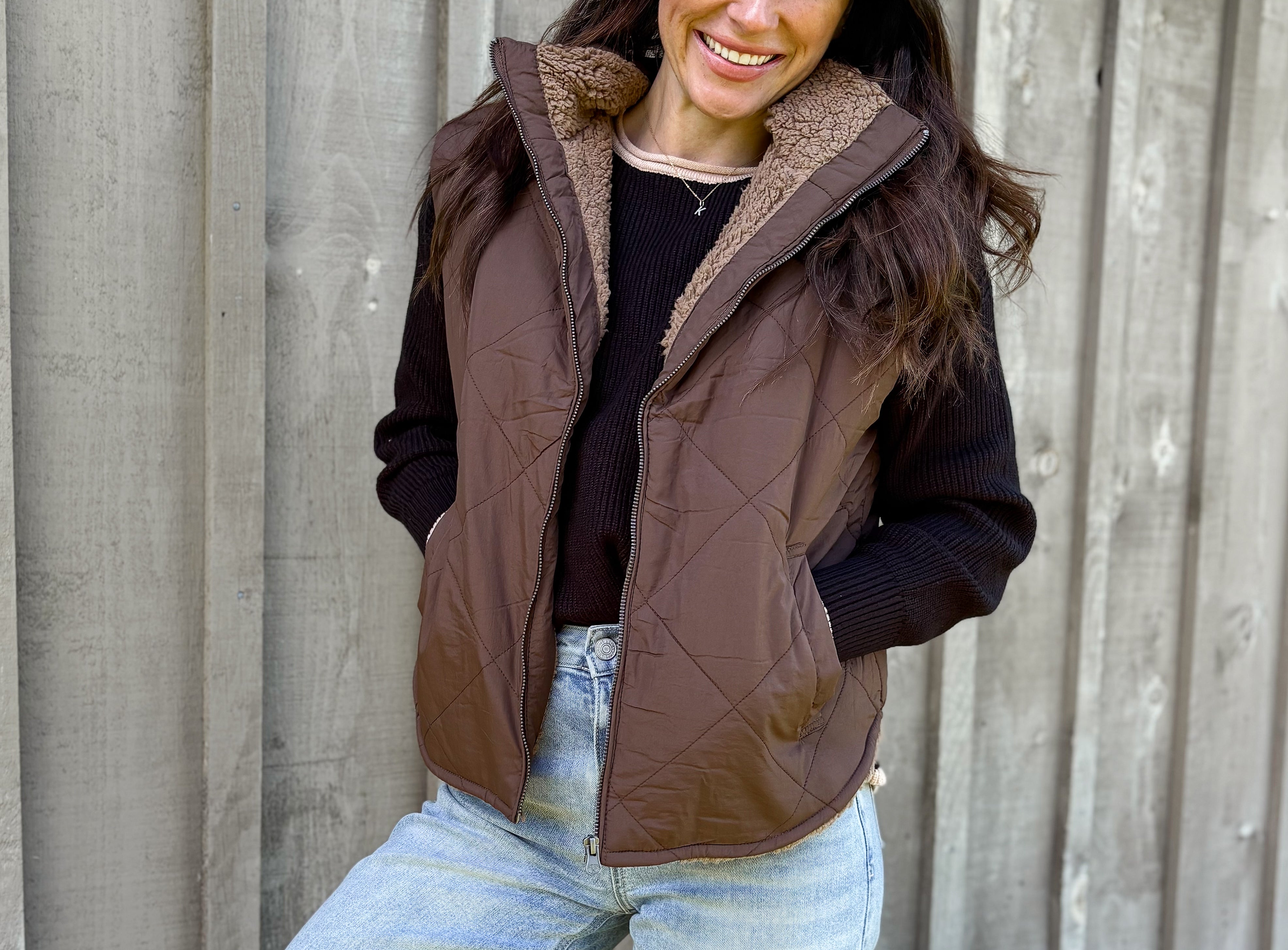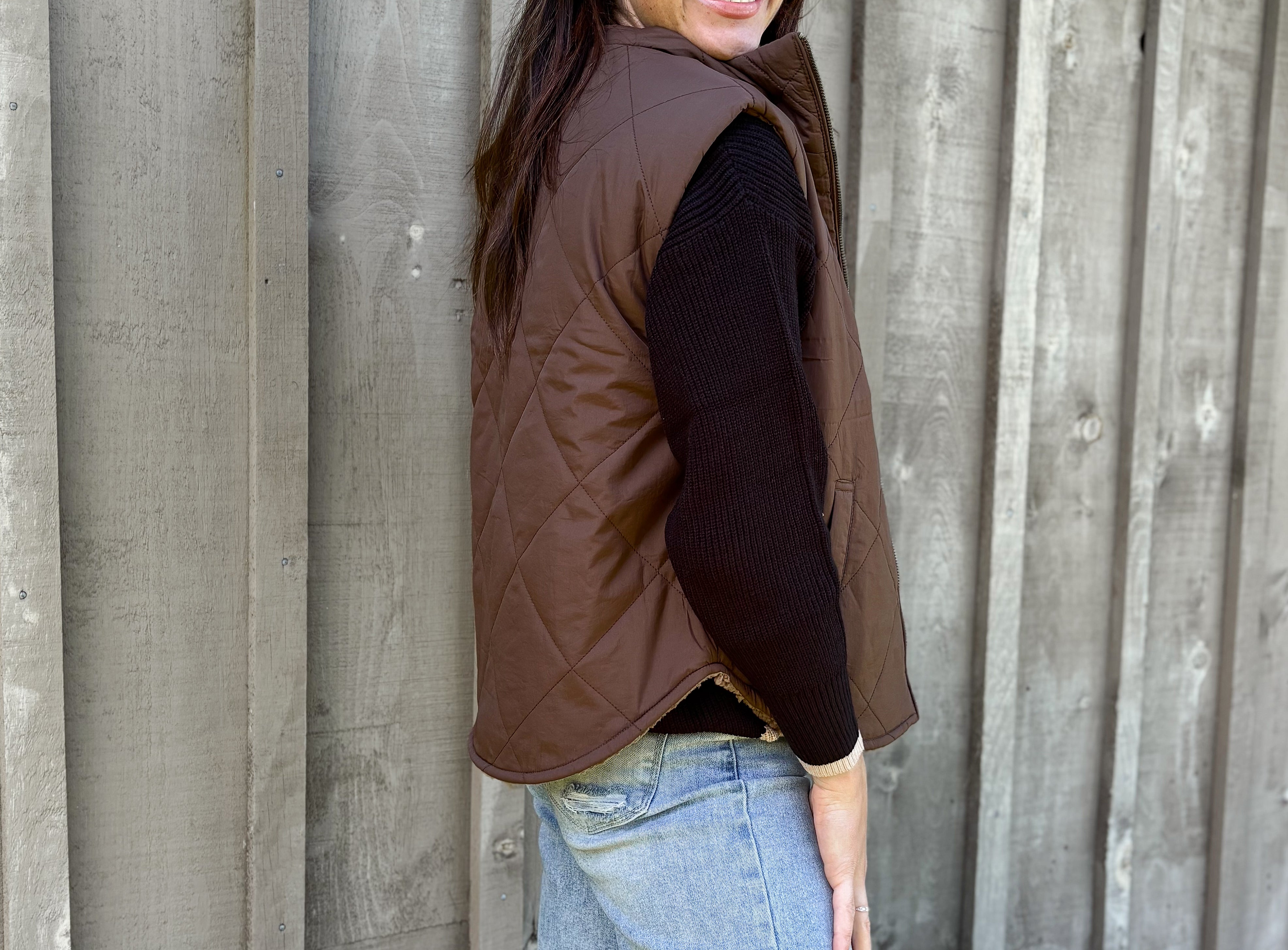 Stay cozy and stylish with the Sab Fleece Lined Puffer Vest. Featuring a soft teddy bear fleece lining and quilted exterior, this long vest offers warmth without bulk. Its full zip closure and side pockets provide both comfort and practicality, making it perfect for layering on chilly days. The rich chocolate brown colour adds a timeless touch to your outfit while keeping you snug and comfortable all day long.