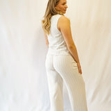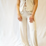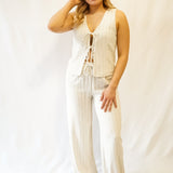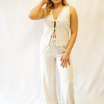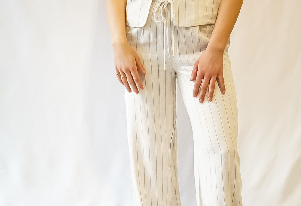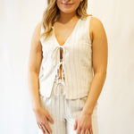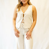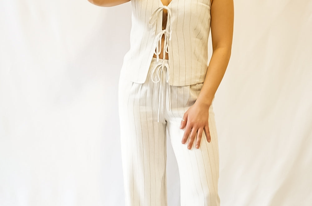 Elevate your style with our Sabrina Pinstripe Vest! Made from natural-looking linen material, this vest features a pinstripe pattern and a double tie for a unique look. Pair it with our Sabrina Pinstripe Pants for a sophisticated and put-together outfit. Upgrade your wardrobe and make a statement with this must-have piece.