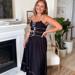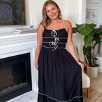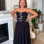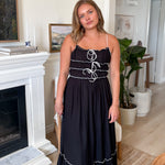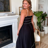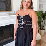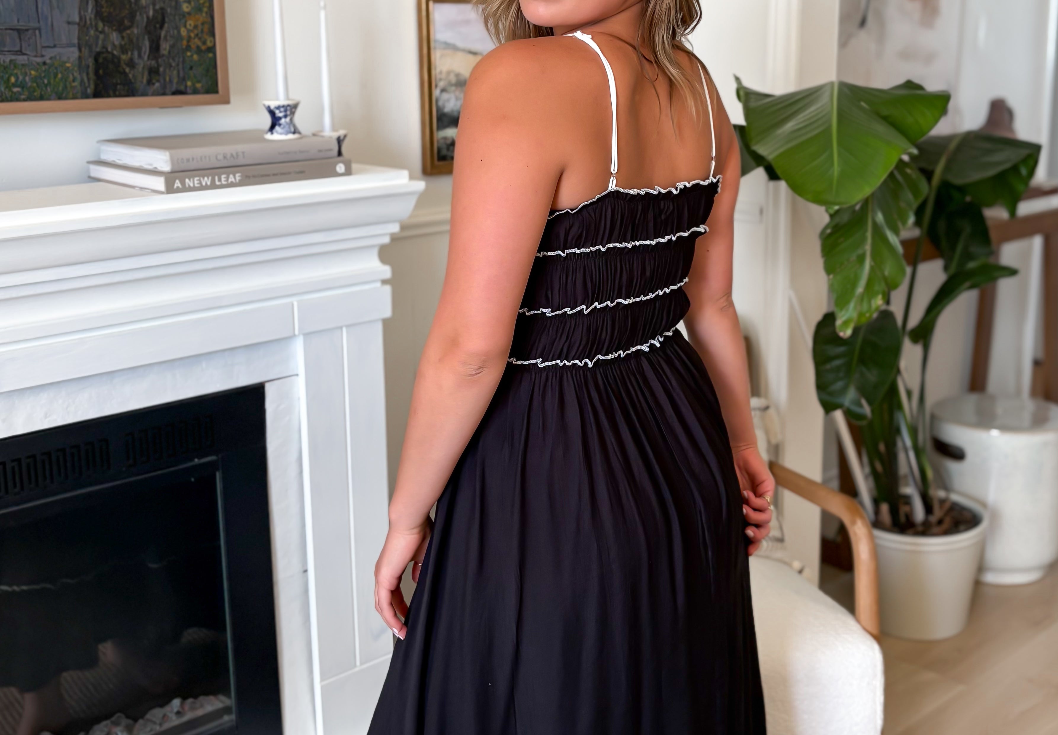The Serena midi dress features delicate spaghetti straps and charming ruffles along the bodice and hem, creating a soft, feminine silhouette. Its beautiful black & white contrast adds a radiant touch, while the back zipper ensures a perfect fit. Fully lined and midi length, this sheer dress offers comfort and elegance for any occasion.