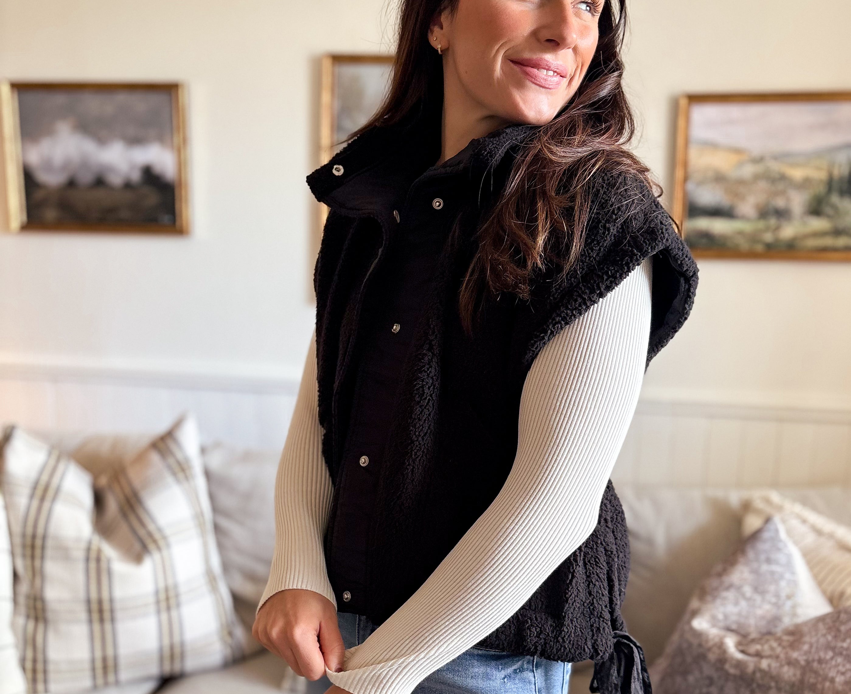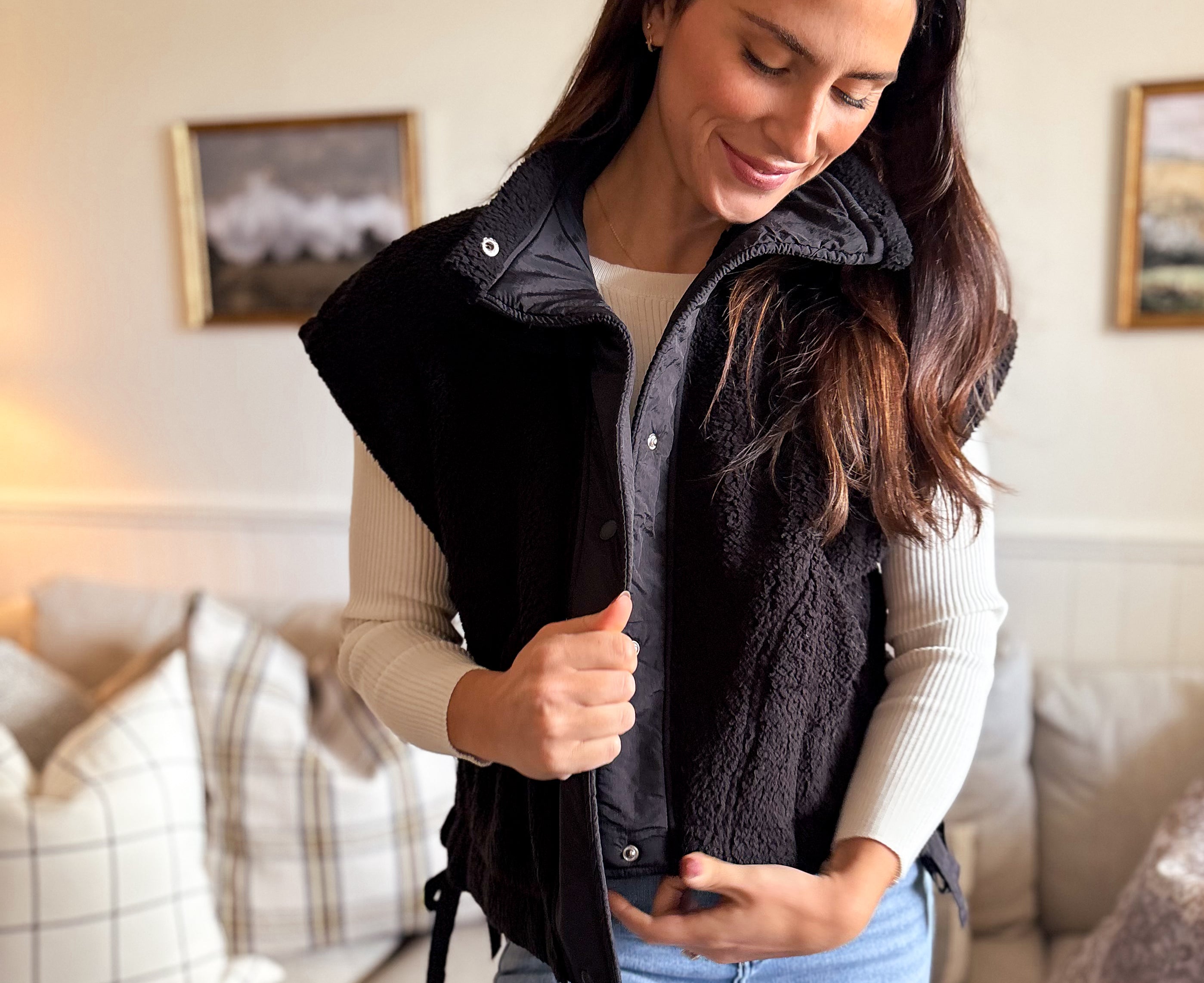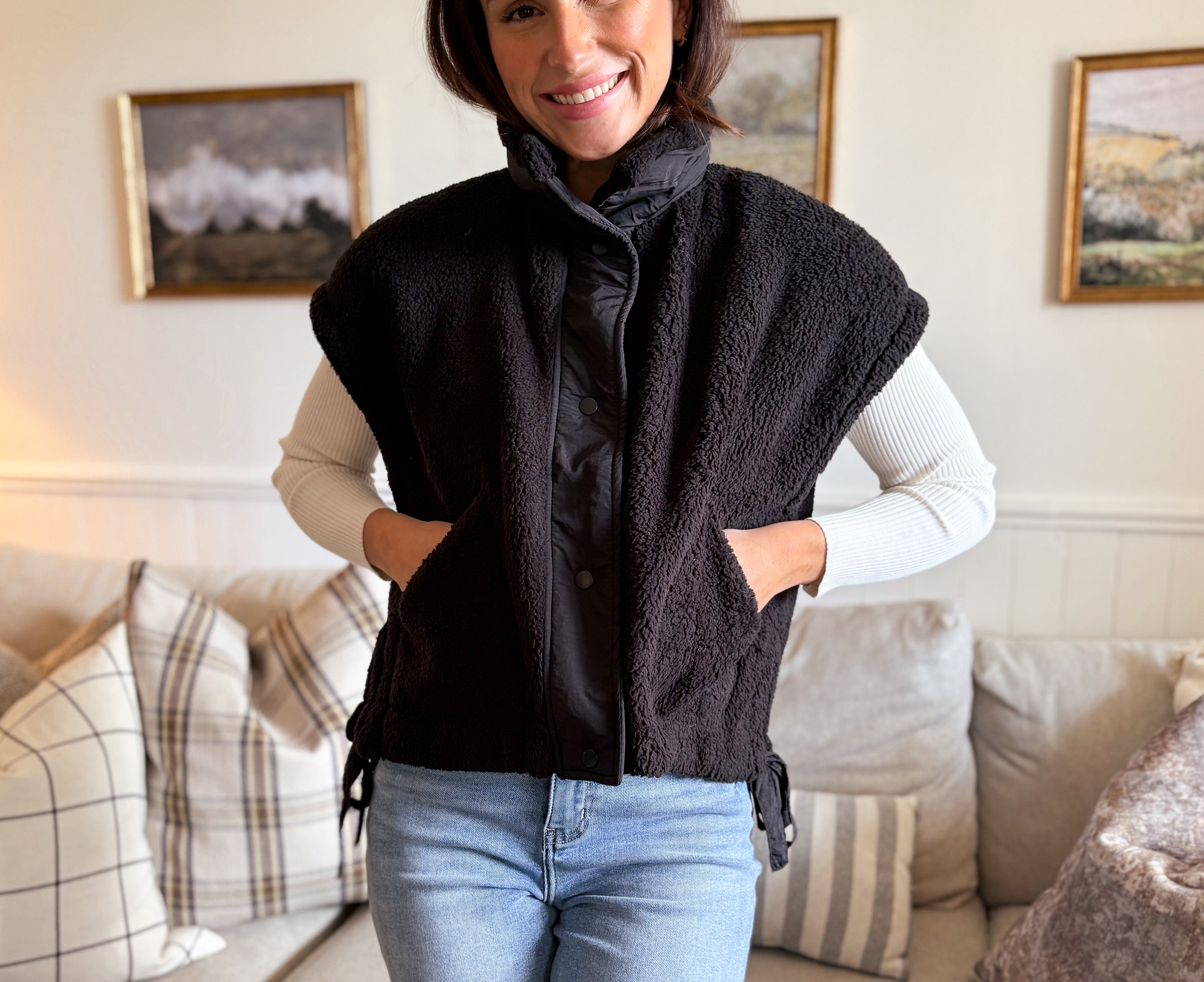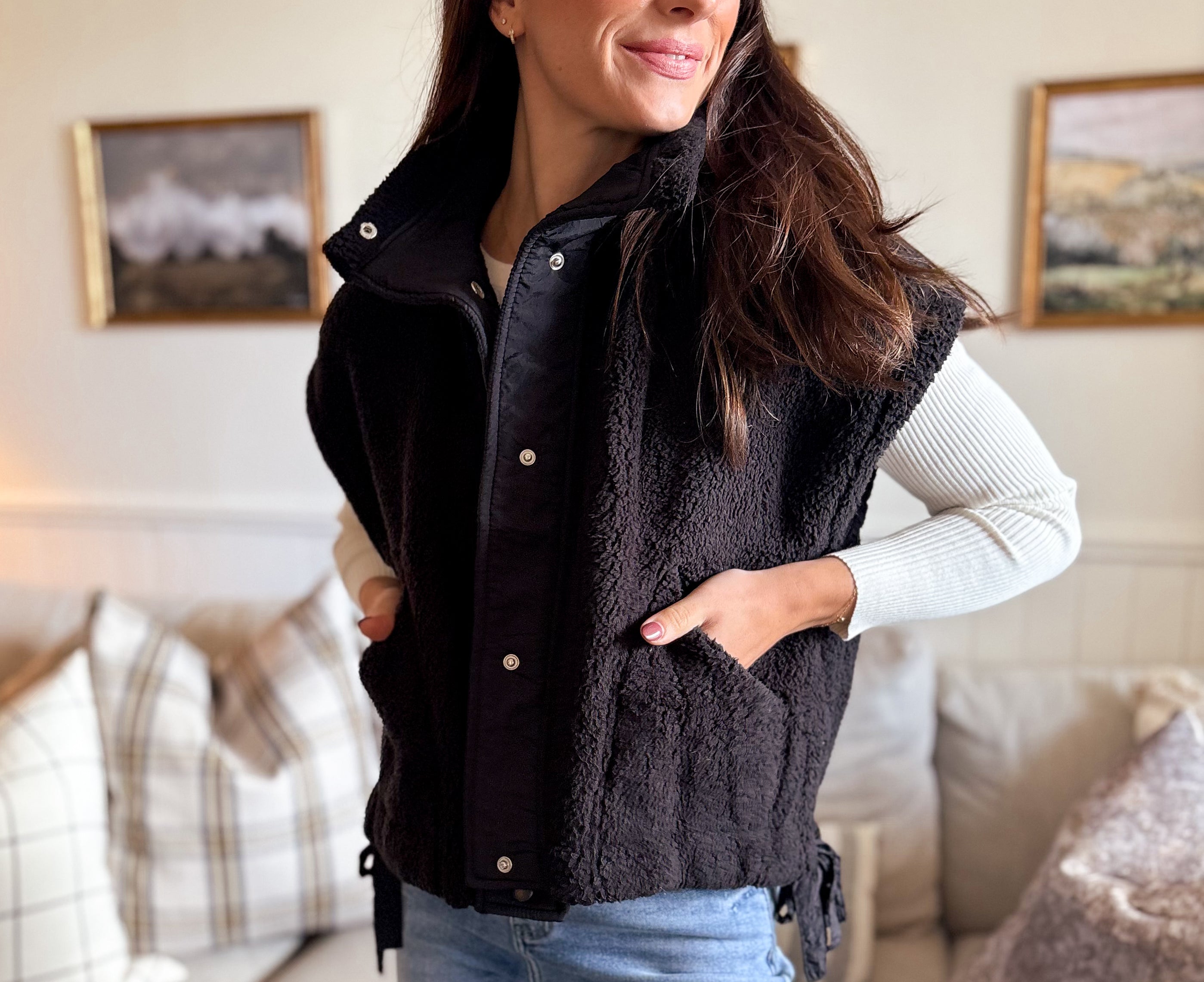 Wrap yourself in cozy comfort with this oversized sherpa vest, designed for effortless style and everyday versatility. Featuring convenient button tabs and functional pockets, it's the perfect layering piece that transitions seamlessly from casual outings to relaxed weekends. The soft sherpa fabric provides warmth without bulk, while the relaxed fit flatters all body types. Whether you're running errands or settling in at home, this black vest delivers the comfort and practicality you've been looking for.